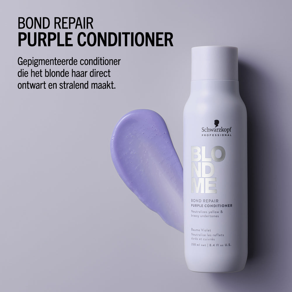 Schwarzkopf Professional BlondMe Bond Repair Purple Conditioner met BOND REPAIR TECHNOLOGY neutraliseert ongewenste gele ondertonen en helpt koperachtigheid te voorkomen. De intens verzorgende formule ontwart het haar direct en maakt het zijdezacht, zonder de haarkleur te veranderen. Verrijkt met amandelolie en korenbloem, voedt deze conditioner het haar en behoudt een frisse, koele blondtint. Daarnaast versterkt het de haarstructuur, vermindert haarbreuk tot 80%, en herstelt schade die gelijk staat aan twee oplichtingsbehandelingen na slechts één gebruik.