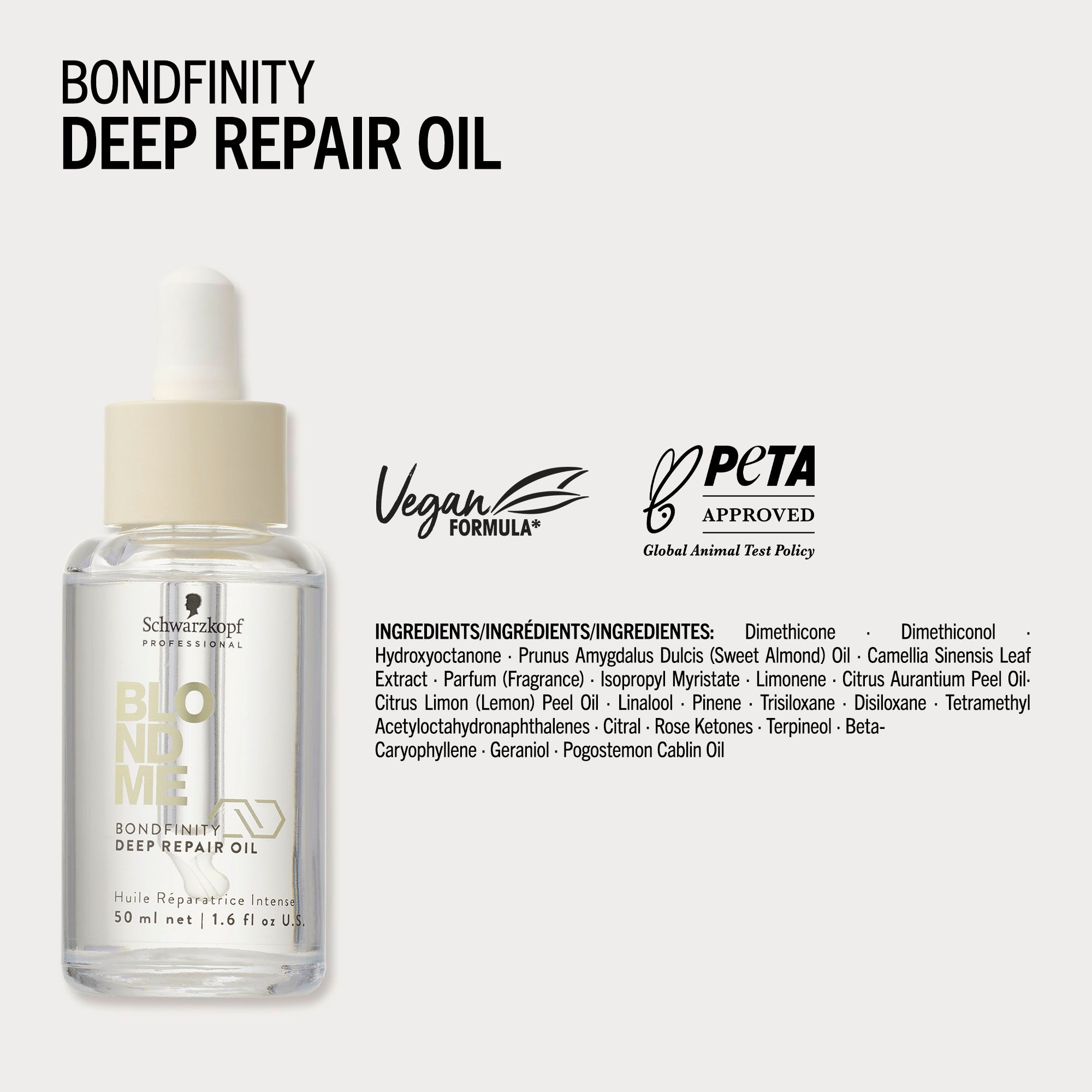 Schwarzkopf Professional BlondMe Bondfinity Deep Repair Oil met BONDFINITY TECHNOLOGY herstelt en versterkt beschadigd haar door veerkrachtige haarverbindingen te creëren en de natuurlijke keratine vast te houden. Deze luxe olie maakt poreus haar glad, biedt 24 uur kroescontrole en geeft een prachtige glans. Bovendien beschermt het tegen hitte tot 230°C, waardoor stylingschade wordt verminderd. Na slechts één gebruik is het haar zeven keer sterker, met langdurig herstel en een zijdezachte finish.