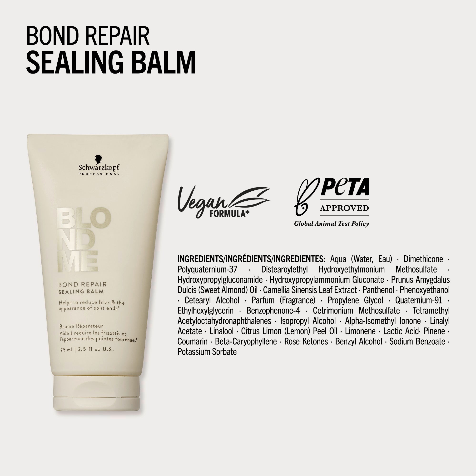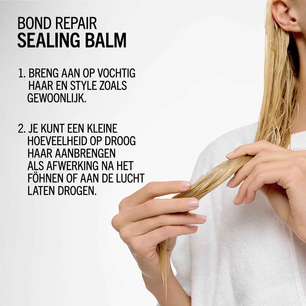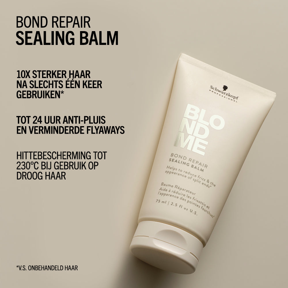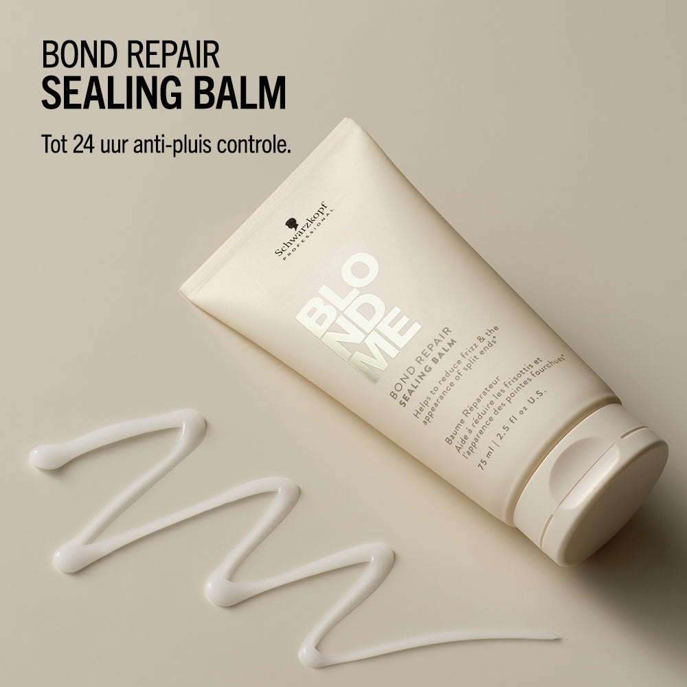 Schwarzkopf Professional BlondMe Bond Repair Sealing Balm met BOND REPAIR TECHNOLOGY helpt gespleten haarpunten te verminderen en zorgt voor glad, zacht en glanzend haar. De formule temt pluizig en springerig haar, terwijl het 24 uur lang controle biedt over kroes. Dankzij hittebescherming tot 230°C is het ideaal voor gebruik vóór stylingtools. Bovendien versterkt het de haarstructuur en herstelt schade die gelijk staat aan twee oplichtingsbehandelingen na slechts één gebruik.