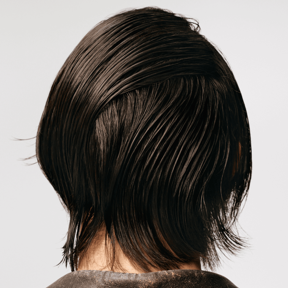 Het haar krijgt een droge, matte finish met flexibele hold en natuurlijke beweging. De look blijft controleerbaar en moeiteloos in model, met zichtbare textuur en definitie.