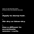 • Laat aan de lucht drogen of gebruik een diffuser om krullen en golven te versterken.