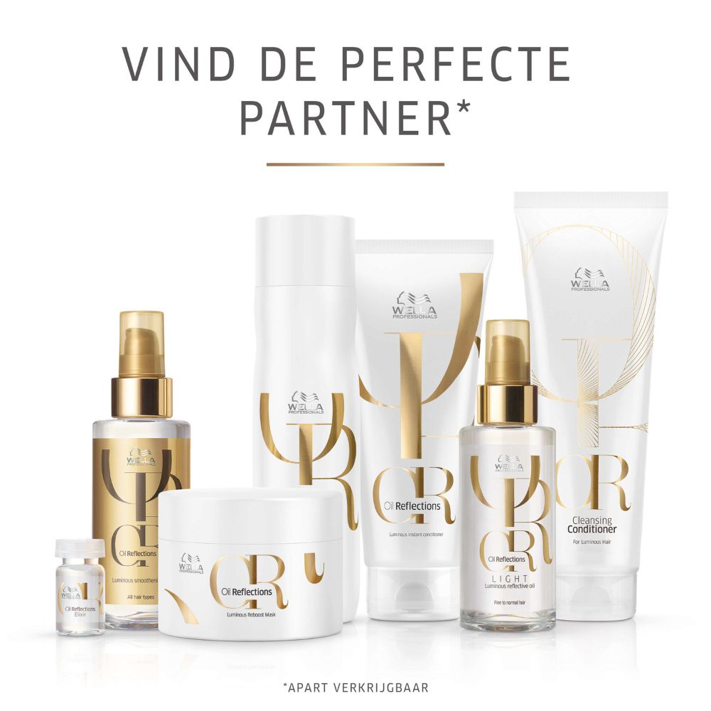 Wella Oil Reflections is een haarolie die het haar verzorgt, zodat het haar glad en glanzend wordt zonder het te verzwaren. De haarolie bevat Macadamia olie, avocado-olie en vitamine E. Dit zijn natuurlijke antioxidanten die het haar optimaal verzorgen. Wella Oil Reflections heeft een betoverende, sensuele geur. De haarolie laat het haar weer prachtig glanzen en glad aanvoelen. De Wella Oil Reflections haarolie kan op verschillende manieren gebruikt worden. Zo kan de olie als leave-in conditioner gebruikt worden, maar ook voor styling en finishing van het haar.