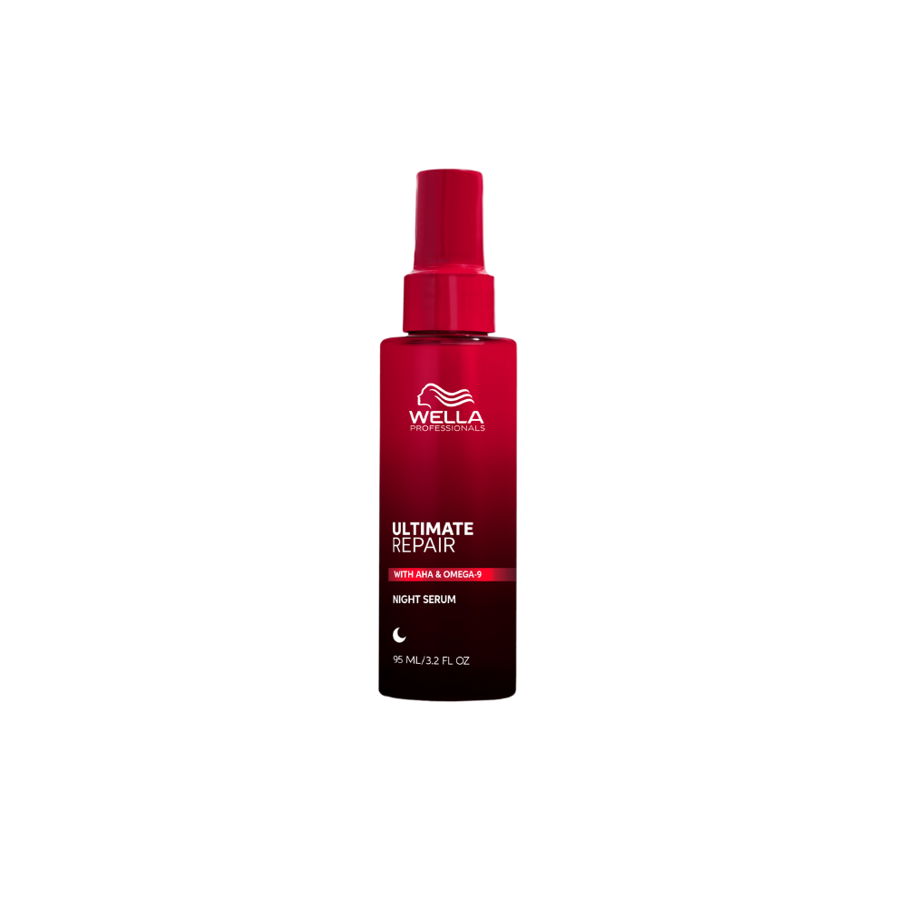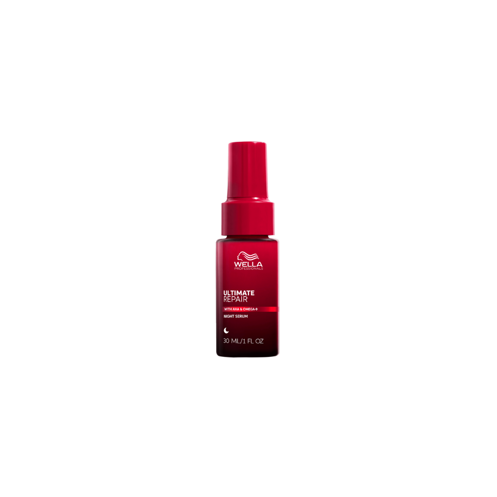 Wella Professionals Ultimate Repair Night Serum is een intensief verzorgend overnight leave-in serum dat zichtbaar dof, droog en beschadigd haar verzorgt en herstelt. Dit serum is verrijkt met Alpha Hydroxy Acid (AHA) en Omega-9, en bevat polymeren die het haar beschermen door een onzichtbare beschermlaag te vormen. Tot wel 78% minder haarbreuk en tot 86% minder gespleten haarpunten, terwijl het het haar tot 8 uur lang voedt tijdens je slaap.