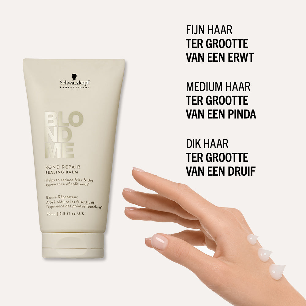 Schwarzkopf Professional BlondMe Bond Repair Sealing Balm met BOND REPAIR TECHNOLOGY helpt gespleten haarpunten te verminderen en zorgt voor glad, zacht en glanzend haar. De formule temt pluizig en springerig haar, terwijl het 24 uur lang controle biedt over kroes. Dankzij hittebescherming tot 230°C is het ideaal voor gebruik vóór stylingtools. Bovendien versterkt het de haarstructuur en herstelt schade die gelijk staat aan twee oplichtingsbehandelingen na slechts één gebruik.