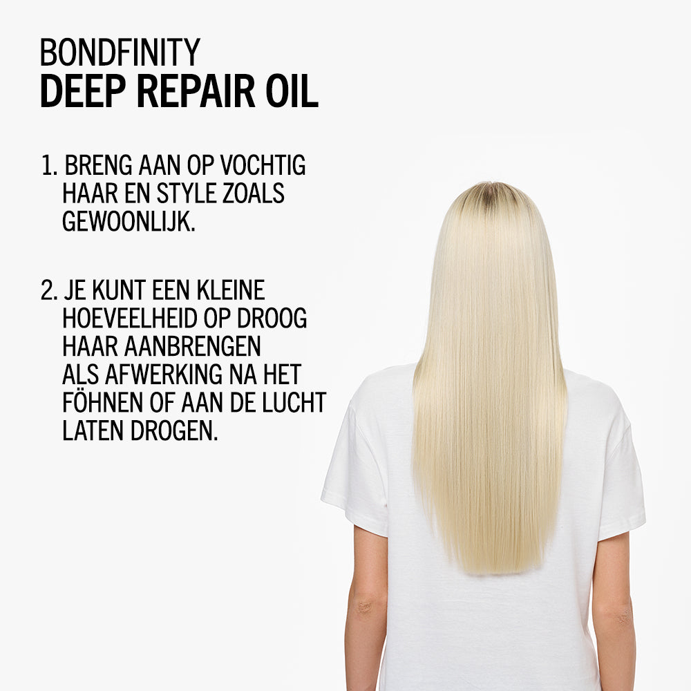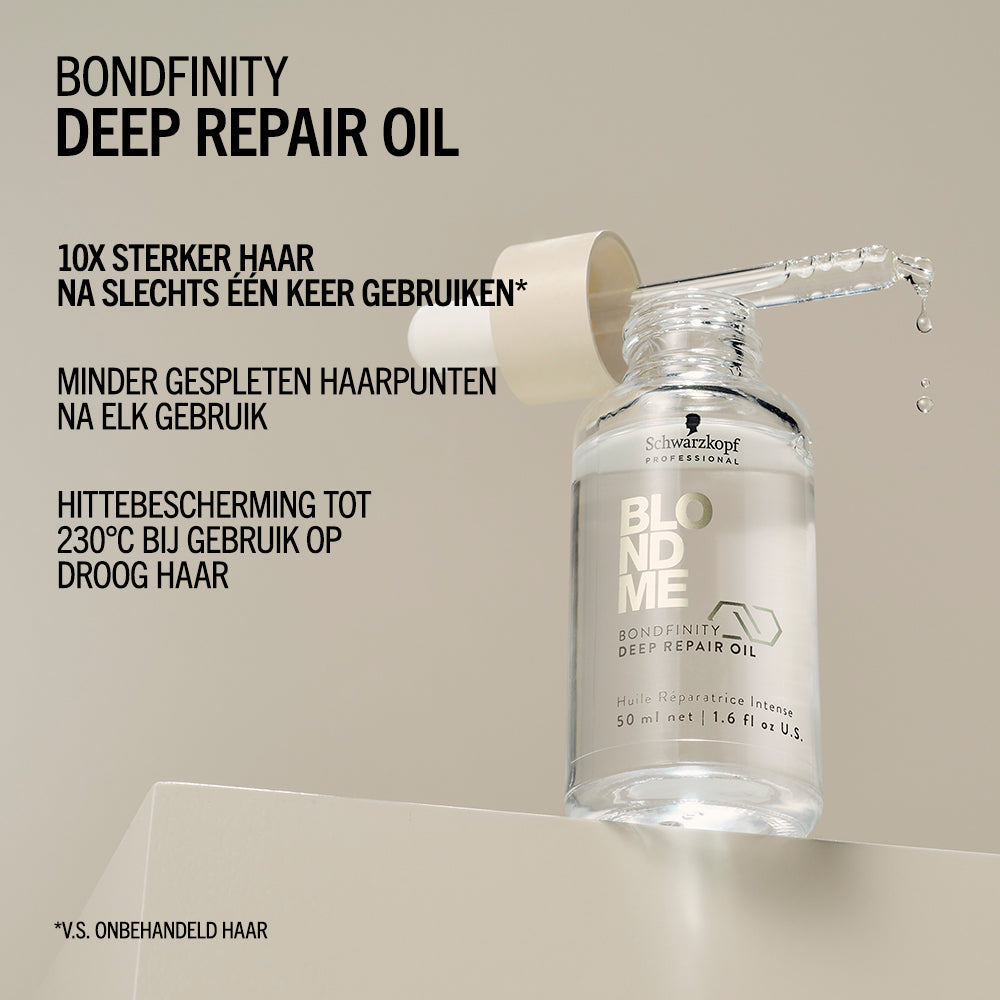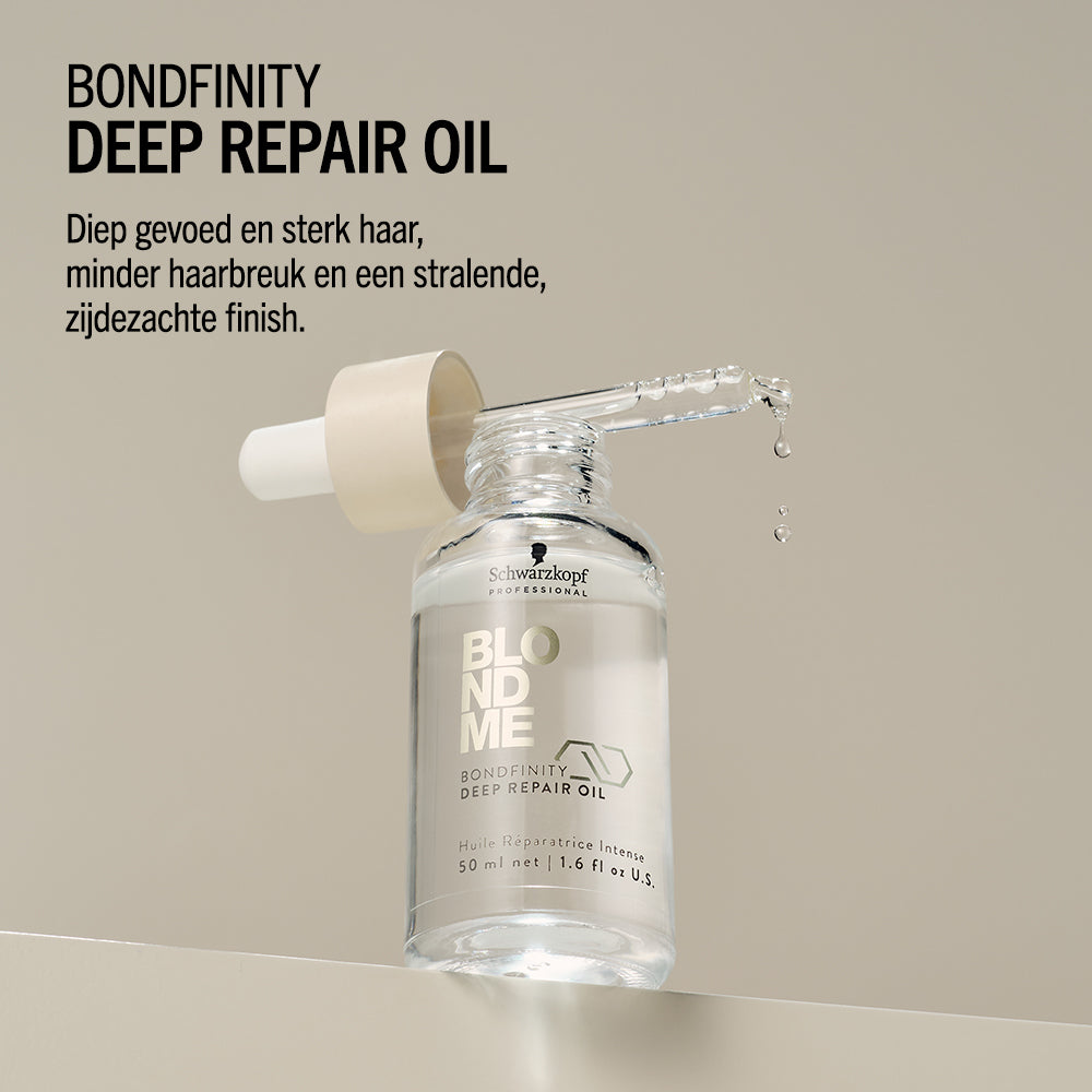 Schwarzkopf Professional BlondMe Bondfinity Deep Repair Oil met BONDFINITY TECHNOLOGY herstelt en versterkt beschadigd haar door veerkrachtige haarverbindingen te creëren en de natuurlijke keratine vast te houden. Deze luxe olie maakt poreus haar glad, biedt 24 uur kroescontrole en geeft een prachtige glans. Bovendien beschermt het tegen hitte tot 230°C, waardoor stylingschade wordt verminderd. Na slechts één gebruik is het haar zeven keer sterker, met langdurig herstel en een zijdezachte finish.