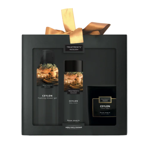 De Treatments® Giftbox Lovely - Ceylon biedt een ultiem luxe verwenmoment voor lichaam en zintuigen. Deze stijlvolle set bevat een romige, verzorgende Foaming Shower Gel en een hydraterende Body Lotion die samen je huid koesteren, terwijl de Scented Candle een warme en ontspannen sfeer creëert. Steek de kaars aan voordat je gaat douchen en laat de badkamer zich vullen met de authentieke geuren van Ceylon: een verfijnde mix van shea noten, sandelhout, patchoeli, fruitbloesem en jasmijn die je zintuigen volledig betovert.