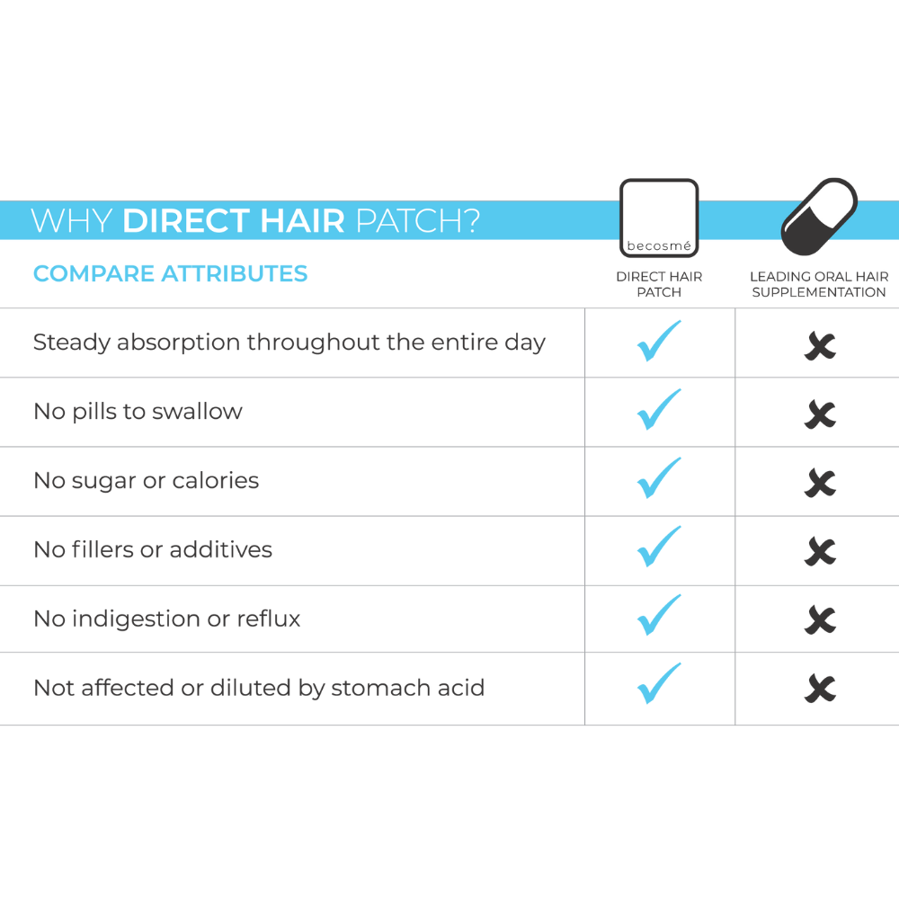 Wil je gezonder en voller haar zonder dagelijks pillen te slikken? Becosmé Direct Hair Patch biedt een revolutionaire oplossing met de eerste transdermale vitamine- en beauty-ingrediënten verrijkte pleister. Deze innovatieve methode zorgt voor een optimale opname van essentiële voedingsstoffen via de huid, waardoor je haar sterker en voller wordt zonder de nadelen van traditionele supplementen.