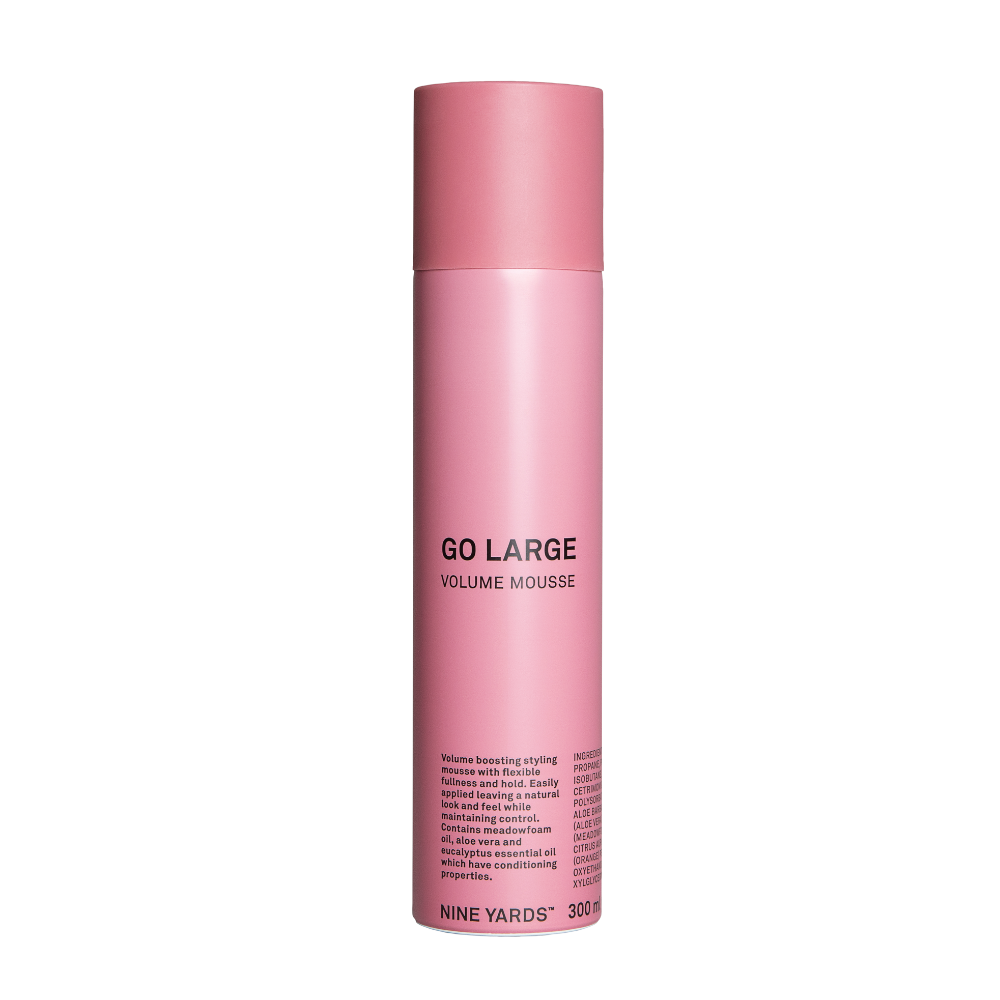 Nine Yards Go Large Volume Mousse voor voller haar met flexibele fixatie. De mousse zorgt voor een flexibele hold, textuur en een voller gevoel, zonder het haar te verzwaren. Perfect voor een volumineuze blow-dry of als basis voor gestylde looks. De subtiele fruitige geur maakt het gebruik extra aangenaam. 100% vegan, boordevol natuurlijke ingrediënten en vrij van parabenen, sulfaten en MIT.