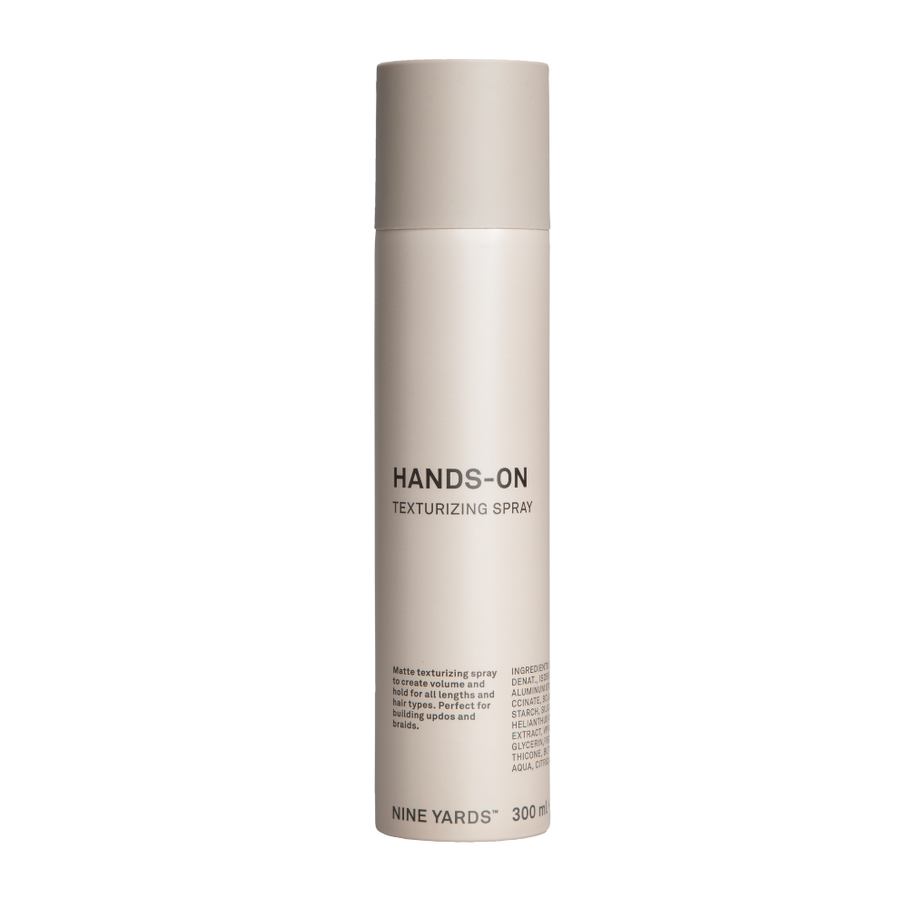 Nine Yards Hands-On Texturizing Spray is een veelzijdige textuurspray met een mat effect en medium hold. De spray geeft het haar direct volume en grip, zonder te verzwaren. Ideaal voor elke haarlengte en haartype om textuur op te bouwen, en perfect als basis voor updo’s, vlechten of een nonchalante look met extra body. 100% vegan, rijk aan natuurlijke ingrediënten en volledig vrij van parabenen, sulfaten en MIT.