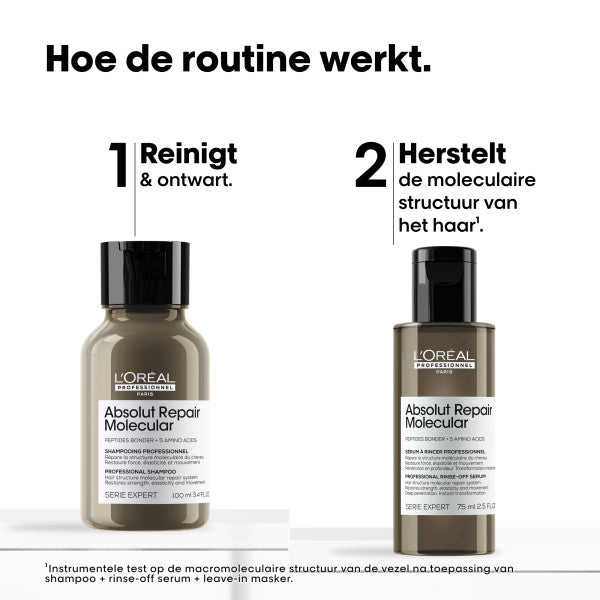 Maak kennis met geavanceerde haarverzorging in twee stappen met de L'Oréal Professionnel Serie Expert Absolut Repair Molecular Mini Duo Kit. Deze professionele discovery set bevat de herstellende shampoo (100 ml) en het krachtige rinse-off serum (75 ml), speciaal ontwikkeld voor ernstig beschadigd of chemisch behandeld haar. Dankzij de unieke formule met Peptiden Bonder en 5 Aminozuren wordt de moleculaire haarstructuur van binnenuit hersteld. Ideaal om cadeau te geven of zelf te ervaren wat écht diep herstel betekent.