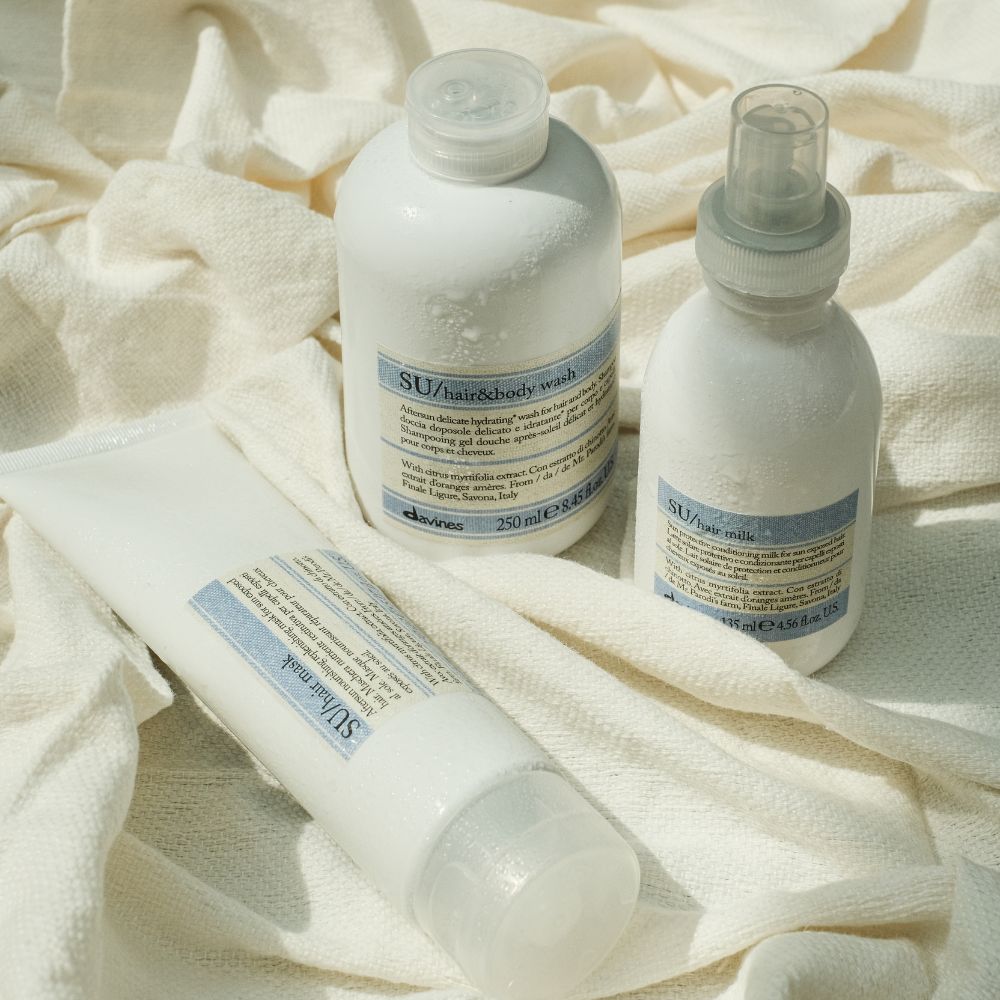 - Breng Davines SU/ Hair & Body Wash aan op nat haar of een vochtige huid