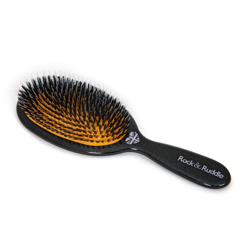 Rock & Ruddle Haarborstel Black Stardust is een hoogwaardige kwaliteitsborstel met een prachtige kleur. Deze haarborstel is gemaakt van fijne natuurlijke varkensharen. Door deze haren helpt de borstel de natuurlijke oliën, die worden geproduceerd door de hoofdhuid, te verdelen over de gehele lengte van het haar. Hierdoor krijgt het haar een prachtige, natuurlijke glans. In elke tand van de borstel zit daarnaast een nylon kern die ervoor zorgt dat klitten makkelijk verdwijnen, zelfs bij dik haar. De rubberen strip geeft net genoeg soepelheid zodat er niet aan het haar wordt getrokken tijdens het borstelen, waardoor het haar niet wordt beschadigd. Deze borstel is bovendien geschikt voor alle haartypes en tevens verkrijgbaar in een kleinere maat zodat u de borstel overal mee naar toe kunt nemen.
