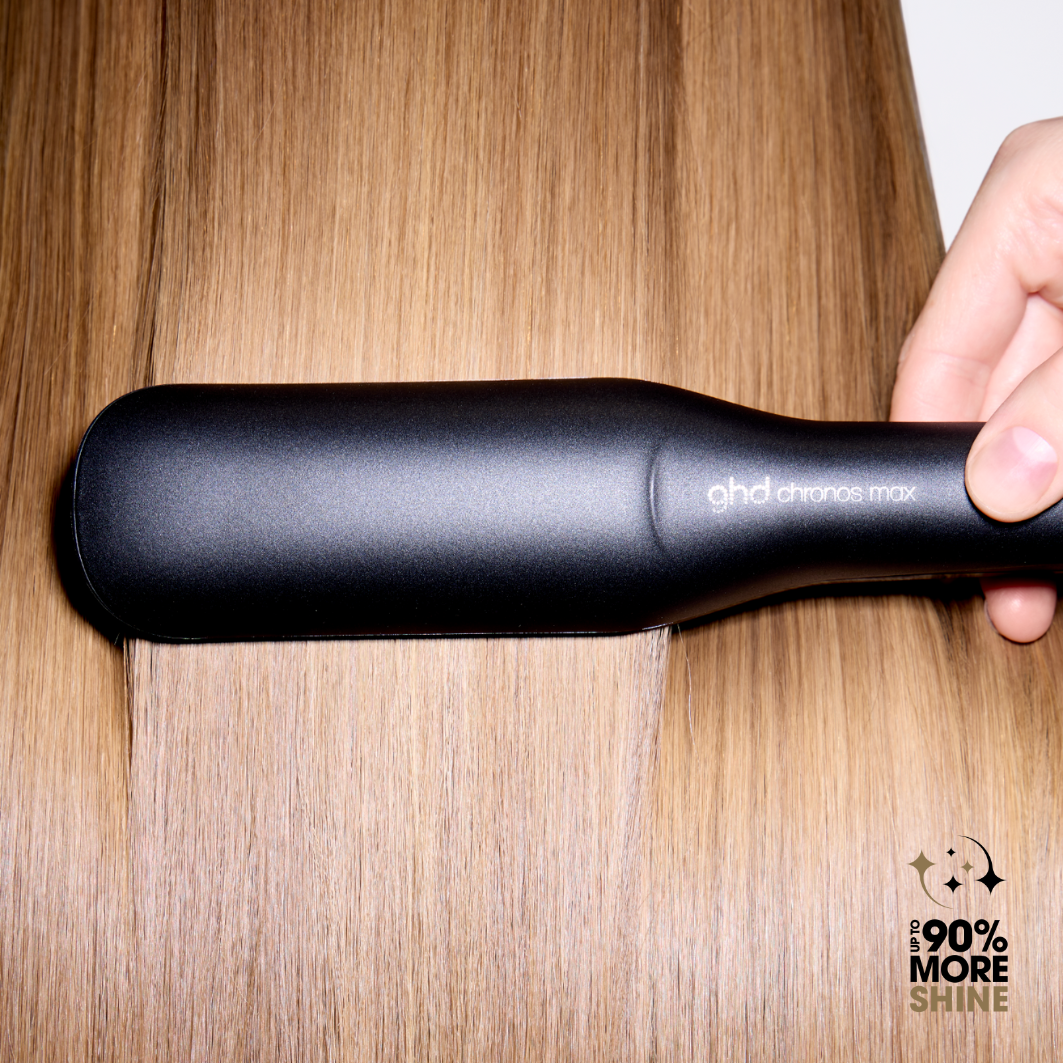 De ghd Chronos Max Styler zwartbiedt ongeëvenaarde prestaties dankzij de 85% bredere keramische platen. Deze innovatieve stijltang is speciaal ontworpen voor lang, dik en krullend haar, en levert 3x snellere styling¹ in slechts één beweging. Met een optimale temperatuur van 185°C en HD motion-responsive™ technologie creëer je gladde, glanzende en pluisvrije looks die tot wel 24 uur blijven zitten.