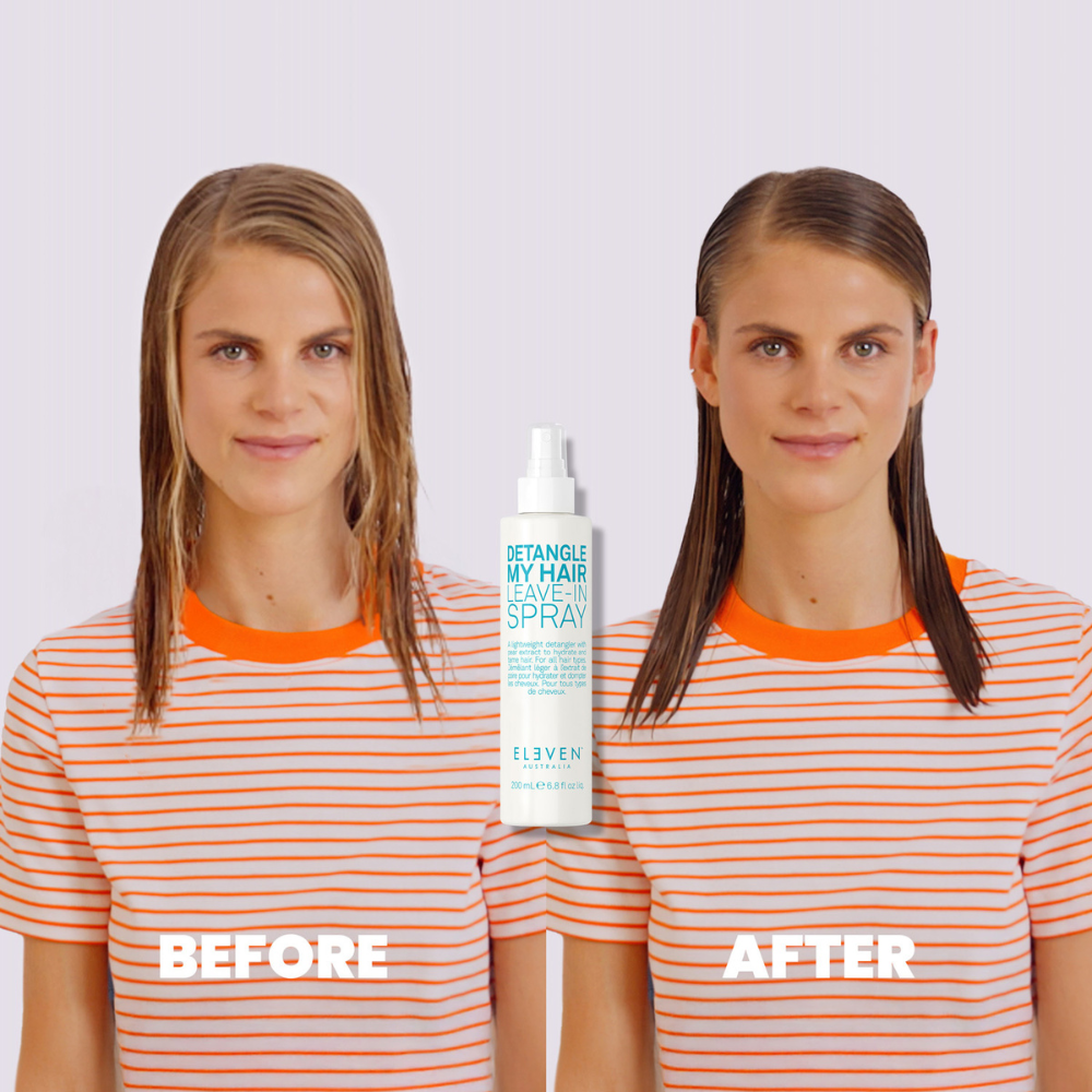 De ELEVEN Australia Detangle My Hair Leave-in Spray ontwart het haar en maakt het gemakkelijker om door te kammen. Deze lichtgewicht spray voedt het haar, geeft het een gezonde glans en zorgt voor een gebalanceerde hoofdhuid. Of je nu last hebt van een geïrriteerde, vette of droge hoofdhuid, deze spray helpt om de balans te herstellen en het haar te verzorgen.