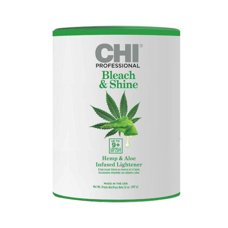 CHI Bleach & Shine Lightener is een krachtige ontkleuring die tot 9 kleurhoogten kan oplichten. De toevoeging van hennep en aloë vera beschermt tegen het afbreken van het haar tijdens het proces. Hennep bevat veel vetzuren, proteïne, vitamine en andere voedingstoffen om het haar te versterken en te verzorgen. Aloë Vera werkt hydraterend, conditioneert en heeft een kalmerende en beschermende werking op de huid en het haar.