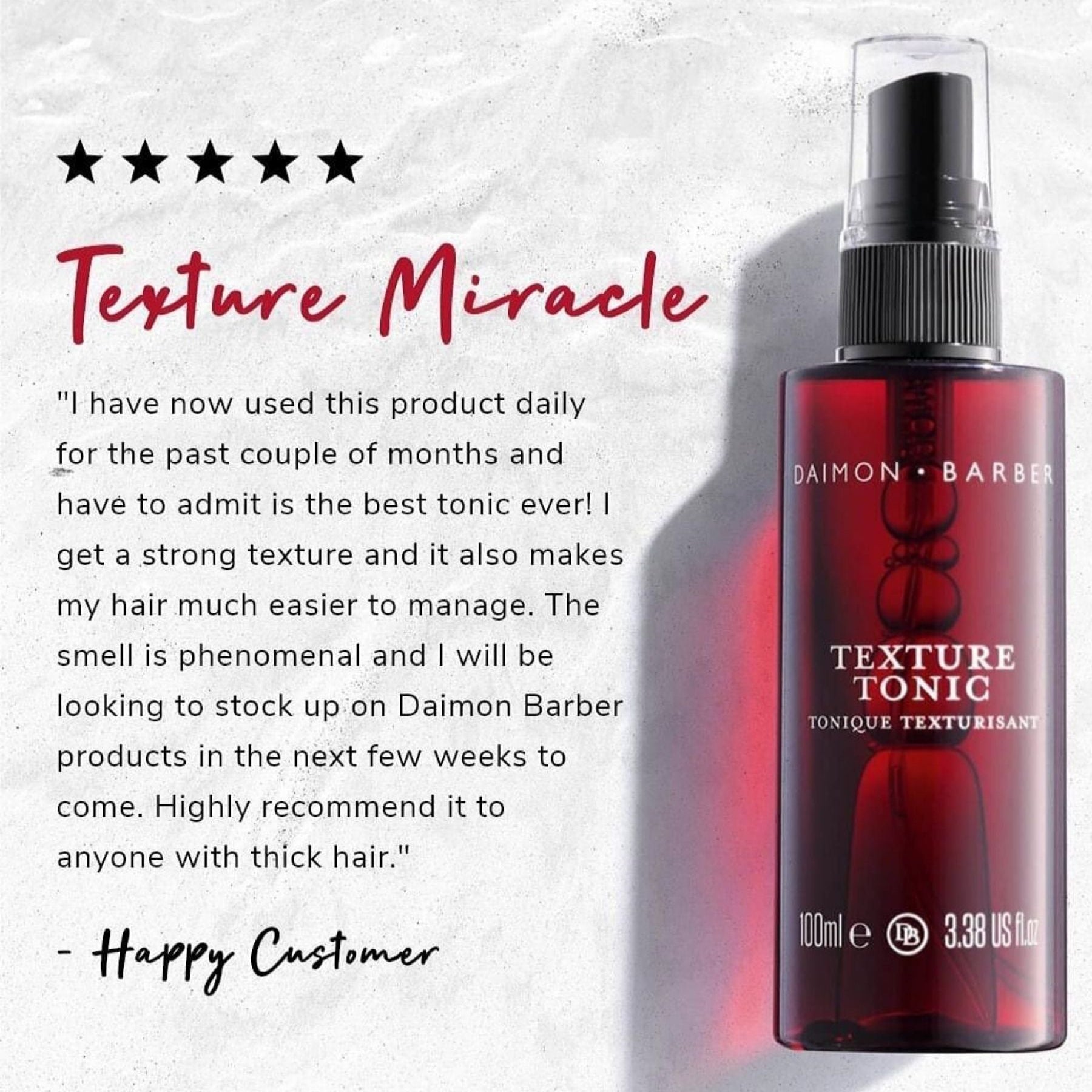 Daimon Barber Texture Tonic, volume, textuur en verzorging in één spray. Deze krachtige styling spray op basis van zeemineralen en plantaardige proteïnen geeft het haar de grip en textuur van een klassieke sea salt spray. Elke haarstreng wordt vanaf de aanzet tot in de punt zichtbaar verdikt voor maximaal volume. Of je het nu gebruikt als pre-styler of als los product, deze tonic tilt jouw haar naar een hoger niveau, zonder stug of droog aan te voelen.