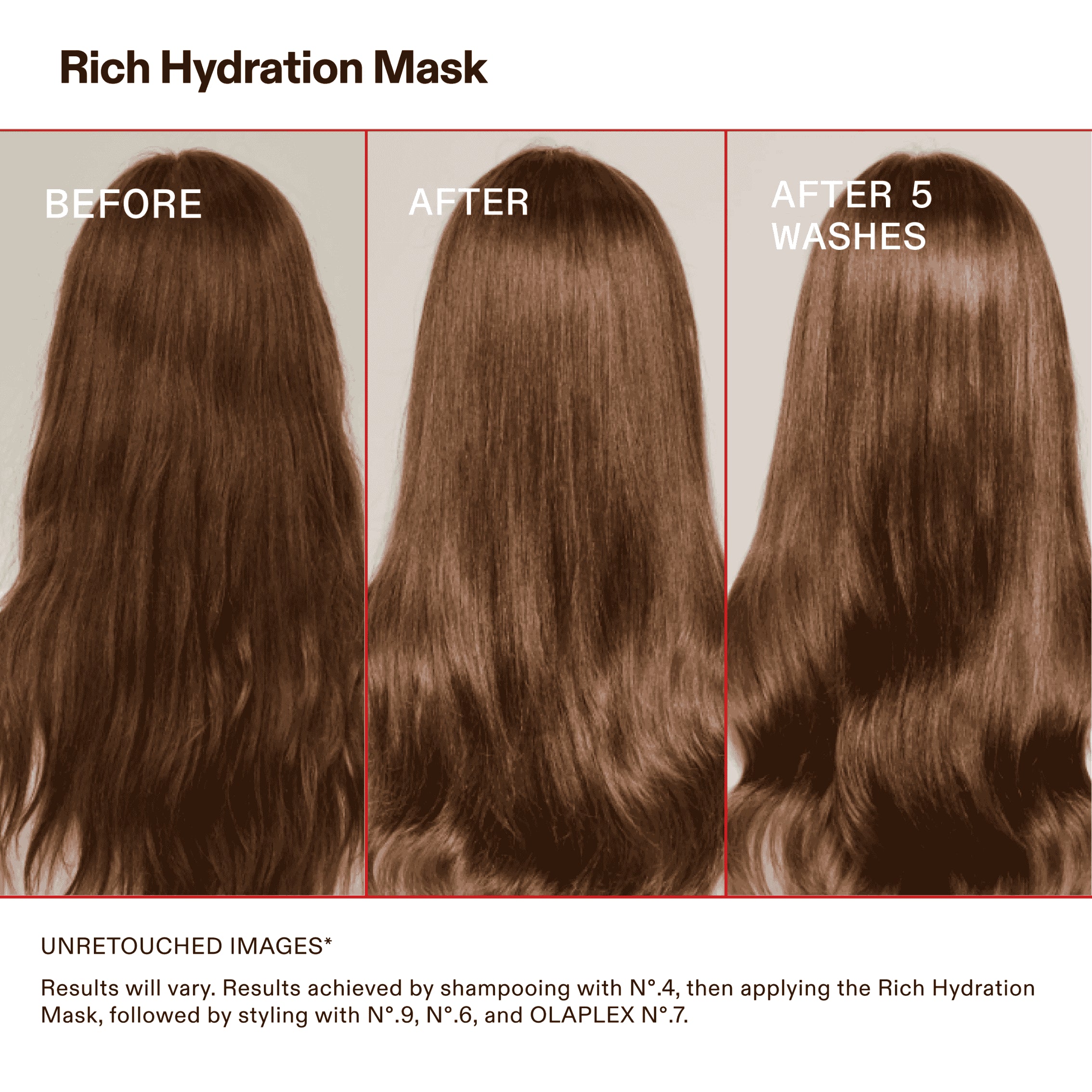 Olaplex Rich Hydration Mask 200ml is hét intensieve verzorgingsmasker voor medium tot stug haar dat extra hydratatie en pluiscontrole nodig heeft. Dit rijke masker voedt het haar diep en maakt het soepel, glanzend en zacht zonder te verzwaren.