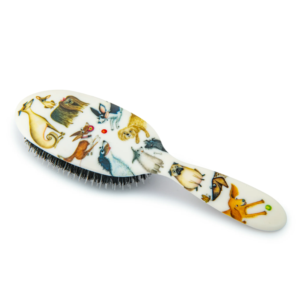 Rock & Ruddle Haarborstel Darling Dogs is een hoogwaardige kwaliteitsborstel met een prachtig design. Deze haarborstel is gemaakt van fijne natuurlijke varkensharen. Door deze haren helpt de borstel de natuurlijke oliën, die worden geproduceerd door de hoofdhuid, te verdelen over de gehele lengte van het haar. Hierdoor krijgt het haar een prachtige, natuurlijke glans. In elke tand van de borstel zit daarnaast een nylon kern die ervoor zorgt dat klitten makkelijk verdwijnen, zelfs bij dik haar. De rubberen strip geeft net genoeg soepelheid zodat er niet aan het haar wordt getrokken tijdens het borstelen, waardoor het haar niet wordt beschadigd. Deze borstel is bovendien geschikt voor alle haartypes en tevens verkrijgbaar in een kleinere maat zodat u de borstel overal mee naar toe kunt nemen.