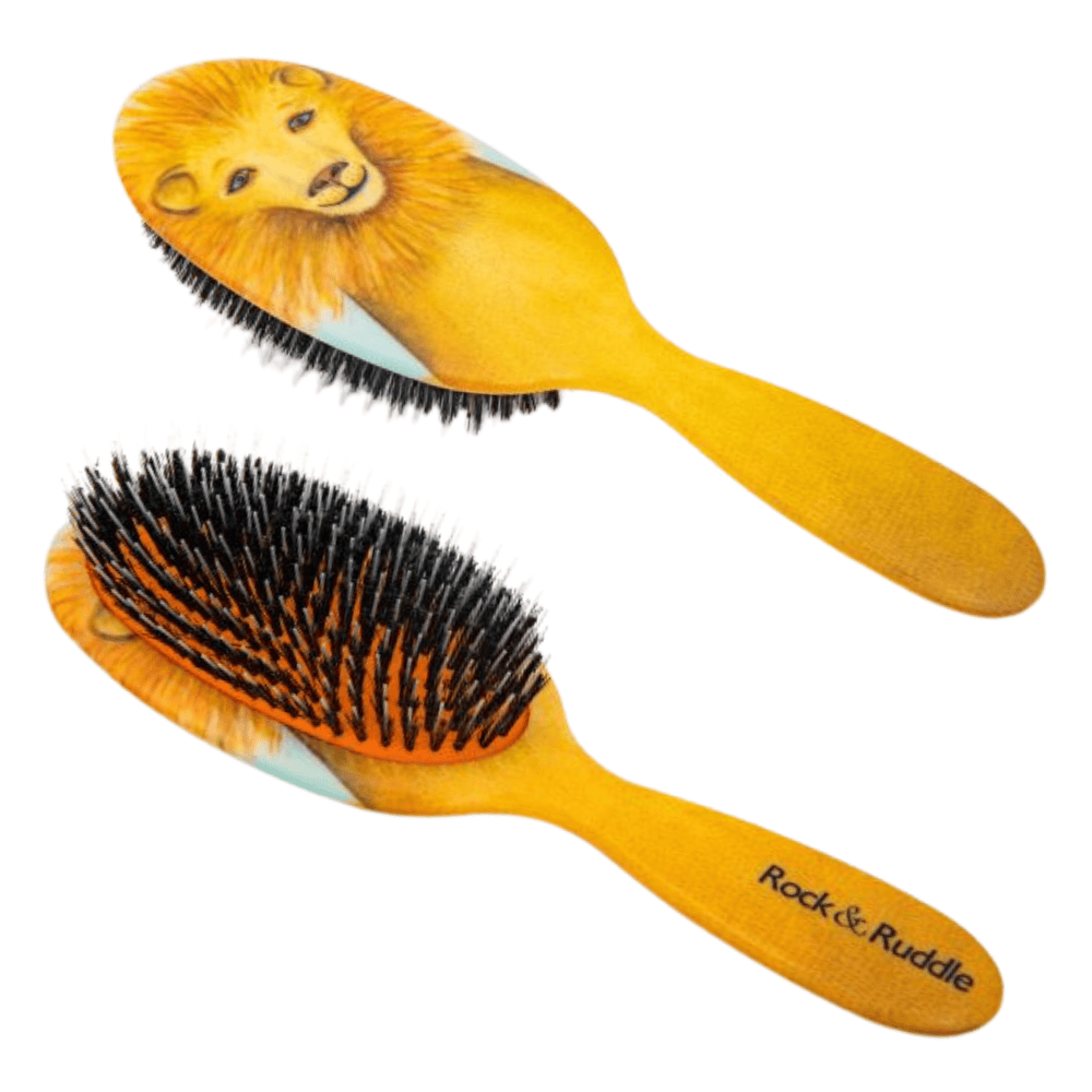 Rock & Ruddle Haarborstel Leeuw is een hoogwaardige kwaliteitsborstel met een prachtig Leeuw design. Deze haarborstel is gemaakt van fijne natuurlijke varkensharen. Door deze haren helpt de borstel de natuurlijke oliën, die worden geproduceerd door de hoofdhuid, te verdelen over de gehele lengte van het haar. Hierdoor krijgt het haar een prachtige, natuurlijke glans. In elke tand van de borstel zit daarnaast een nylon kern die ervoor zorgt dat klitten makkelijk verdwijnen, zelfs bij dik haar. De rubberen strip geeft net genoeg soepelheid zodat er niet aan het haar wordt getrokken tijdens het borstelen, waardoor het haar niet wordt beschadigd. Deze borstel is bovendien geschikt voor alle haartypes en tevens verkrijgbaar in een kleinere maat zodat u de borstel overal mee naar toe kunt nemen.