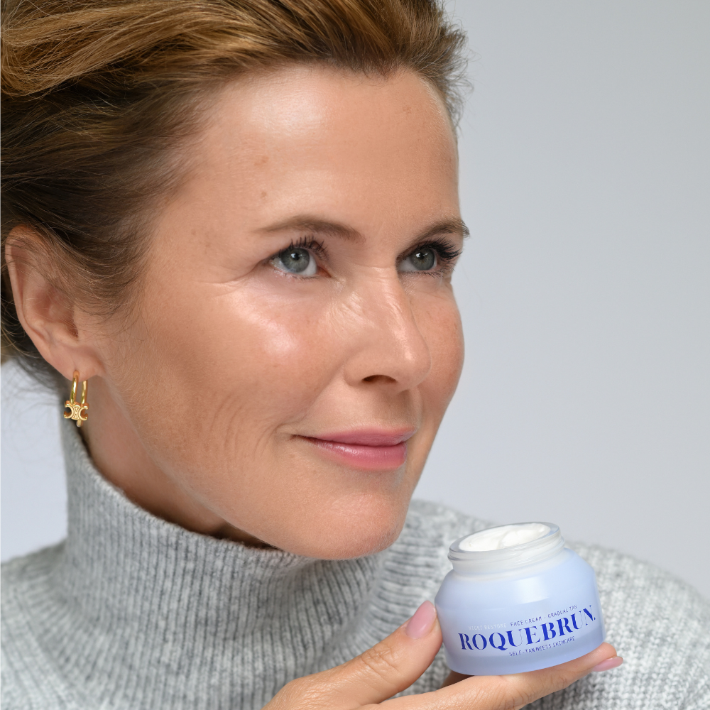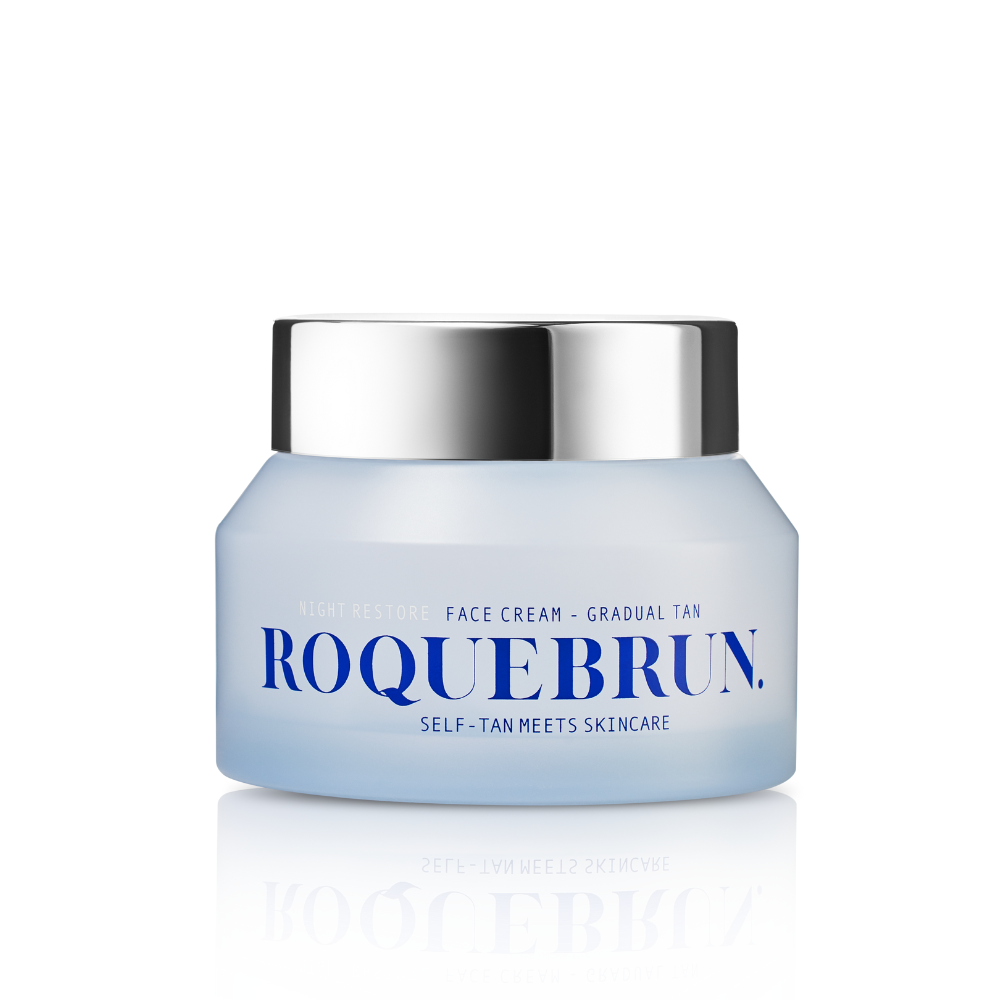 ROQUEBRUN. Night Restore Face Cream - Gradual Tan combineert huidverzorging en tanning in één luxe nachtcrème. Terwijl jij slaapt, bouwt deze crème een subtiele, natuurlijke glow op en voedt je huid intensief. Het resultaat: een frisse, egale teint zonder strepen of oranje ondertoon.