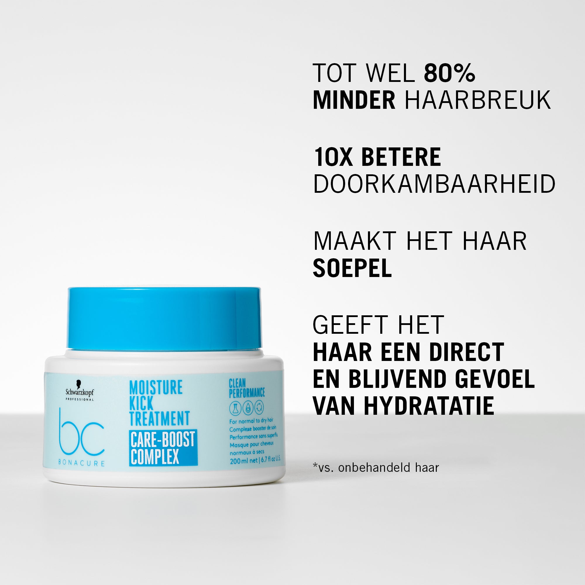 Schwarzkopf Professional Bonacure Moisture Kick Treatment is een intens hydraterende, crème-achtige behandeling die droog, broos, golvend of krullend haar nieuw leven inblaast. Deze formule is speciaal ontwikkeld voor haar dat dagelijks een vochtboost nodig heeft, en herstelt de natuurlijke balans zonder te verzwaren. Het resultaat is zacht, soepel en zichtbaar gezond haar met een mooie glans.