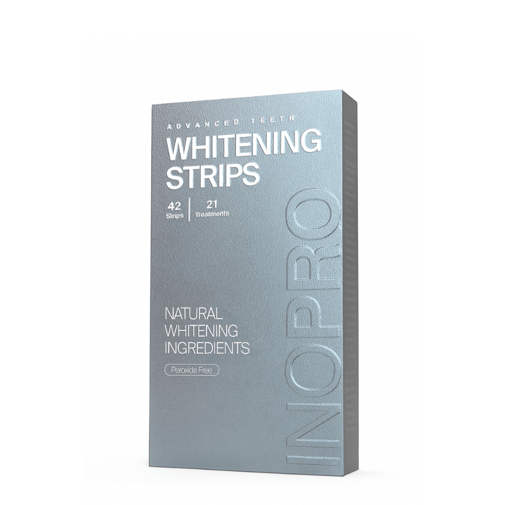INOPRO Advanced Whitening Strips 21 Treatments zijn speciaal ontwikkeld voor gevoelige tanden en zorgen voor een natuurlijke, veilige whitening zonder peroxide. Dankzij actieve enzymen uit papaya (papain) en ananas (bromelain), in combinatie met kokosolie en citroenschilolie, worden hardnekkige vlekken van koffie, thee, wijn en tabak voorzichtig verwijderd zonder het glazuur te beschadigen. De strips zijn alcoholvrij, SLS-vrij en geschikt voor dagelijks gebruik. Met de meegeleverde shade guide volg je eenvoudig je voortgang richting een stralendere lach.