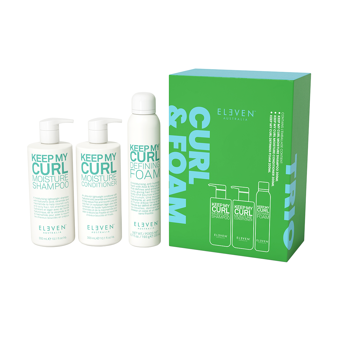 Met het ELEVEN Australia Curl & Foam Trio geef je krullen alles wat ze nodig hebben in één complete set: milde reiniging, intensieve verzorging en langdurige definitie. De perfecte deal voor wie het natuurlijke krulpatroon wil versterken zonder pluis of zwaarte.