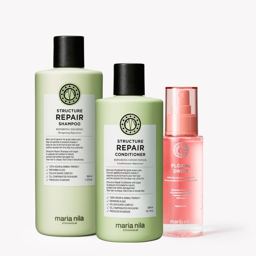 Deze set bevat: Maria Nila Structure Repair Shampoo 350ml, Maria Nila Structure Repair Conditioner 300ml en Maria Nila Floral Drift Hair Mist 100ml