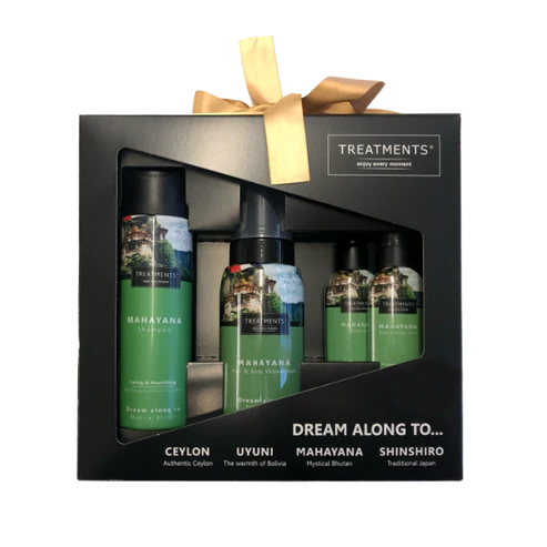 Een ontspannen wellness moment begint met de Treatments Giftbox Relax - Mahayana. Reinig je haar met de Shampoo en verzorg tegelijkertijd je hoofdhuid. De Hair & Body Shower Foam reinigt je huid met een luchtige structuur en is tevens geschikt voor het haar. De Body Oil verzacht, voedt en beschermt je huid. Sluit je routine af met de verfrissende Bed & Body Mist, waarmee zowel je huid als textiel een heerlijke Mahayana geur dragen.