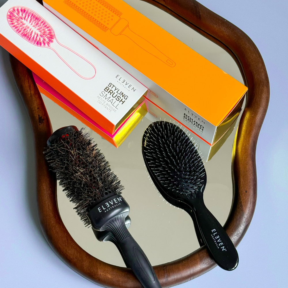 De ELEVEN Australia Large Round Brush 43mm is een geavanceerde borstel ontworpen om je föhn-ervaring te verbeteren. De binnenkant van de borstel is gemaakt van magnesium, wat de warmte beter vasthoudt en leidt, waardoor de droogtijd wordt verkort. De borstel heeft een combinatie van hoogwaardige materialen: nylonharen en cruelty-free wilde zwijnenharen. De nylonharen ontwarren het haar op een zachte manier, terwijl de wilde zwijnenharen statisch haar voorkomen, extra glans geven en het haar zijdezacht maken.