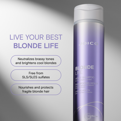 De Joico Blonde Life Violet Shampoo is een zilvershampoo die speciaal is ontwikkeld om de koele tonen in blond, grijs of verlicht haar te versterken. Deze shampoo neutraliseert effectief geel- en kopertinten en zorgt ervoor dat je haarkleur fris en levendig blijft. Dankzij de toevoeging van Tamanu- en Monoï-oliën verzorgt het je haar intensief, waardoor het zacht en glanzend aanvoelt. Deze milde reinigende shampoo is perfect voor iedereen die een koele blonde haarkleur wil behouden zonder ongewenste warme tinten.