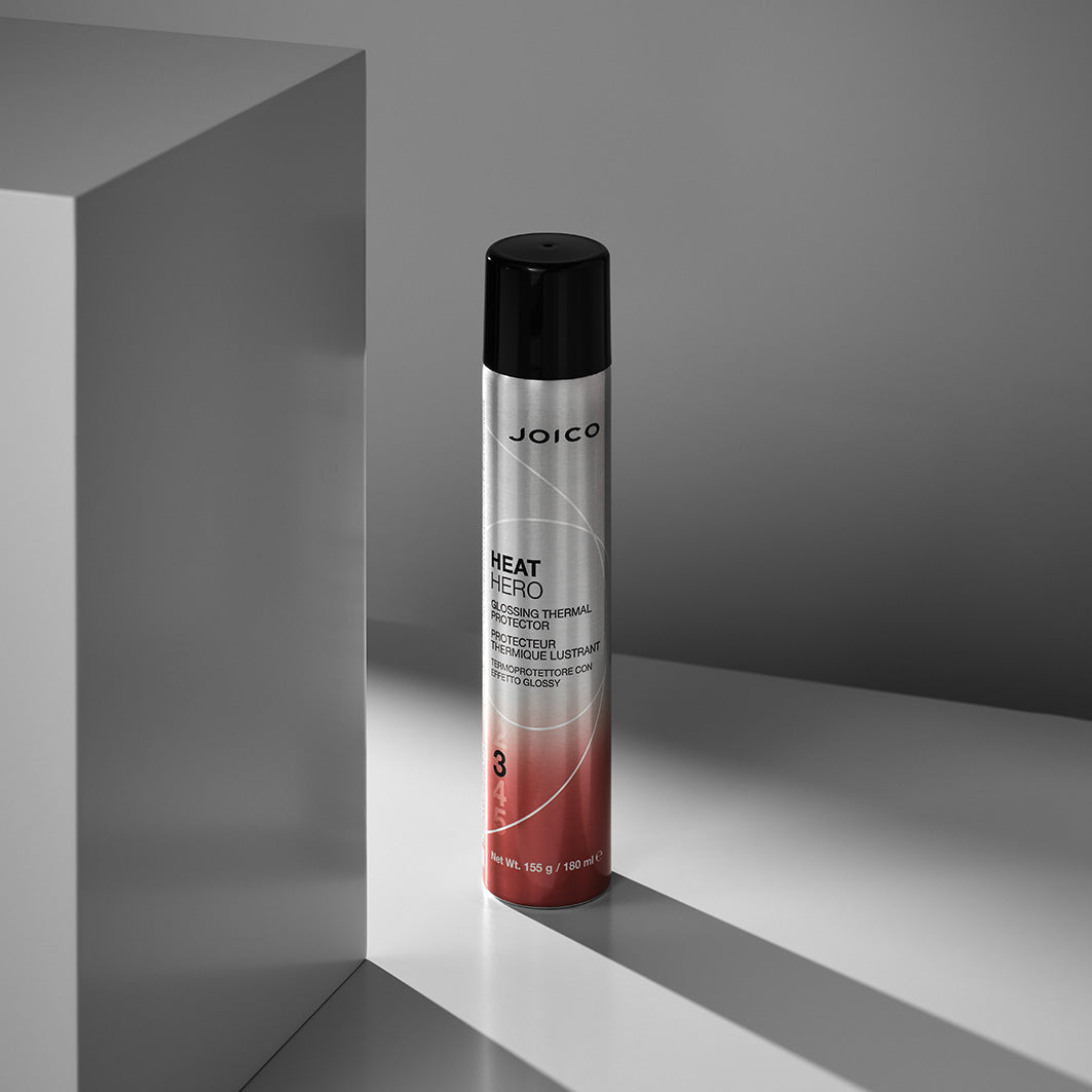 • Spray Joico Heat Hero Glossing Thermal Protector royaal op elke sectie voordat je stylingtools gebruikt.