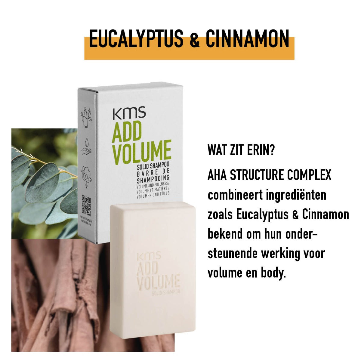 Deze shampoo in vaste vorm geeft het haar meer body en volume. In de jaren ’70 bracht KMS al een shampoo in vaste vorm op de markt, de NEFA Bar (Natural Essential Fatty Acid Cleansing Bar). Vandaag de dag is KMS terug met de Solid Shampoo! De KMS AddVolume Solid Shampoo is een professionele shampoo, speciaal geschikt voor fijn en slap haar. De shampoo heeft een ultramild reinigingssysteem met een geweldig schuim en bevat 78% ingrediënten van natuurlijke oorsprong, waaronder eucalyptus.