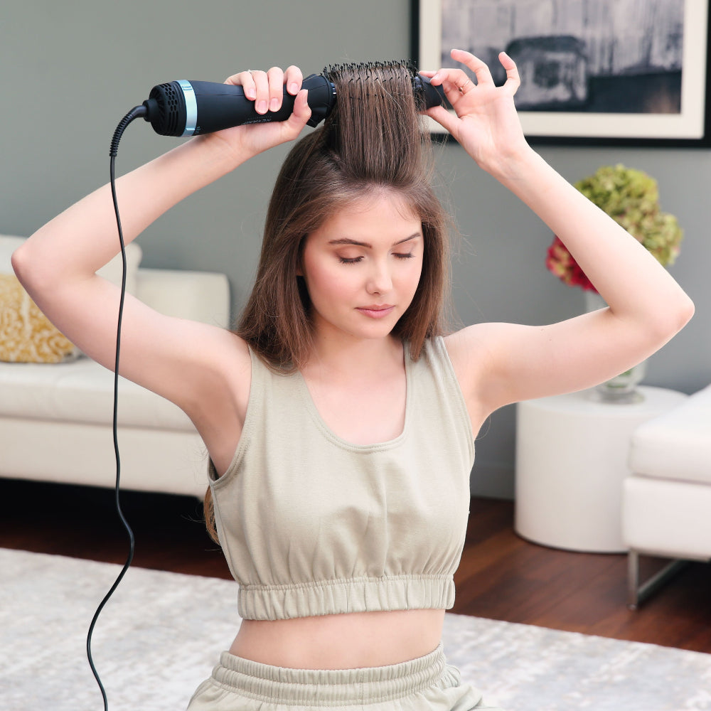 Gebruik voorafgaand aan het stylen een hittebeschermende spray of serum. Zet de borstel op het haar bij de haaraanzet en beweeg de borstel in een vloeiende beweging naar beneden. Voor lichte slag of krullen kan de volumeborstel naar binnen gedraaid worden. Herhaal dit over het gehele haar tot het gewenste resultaat bereikt is. Spray tot slot nog een haarlak over het haar om er voor te zorgen dat het haar de hele dag blijft zitten.