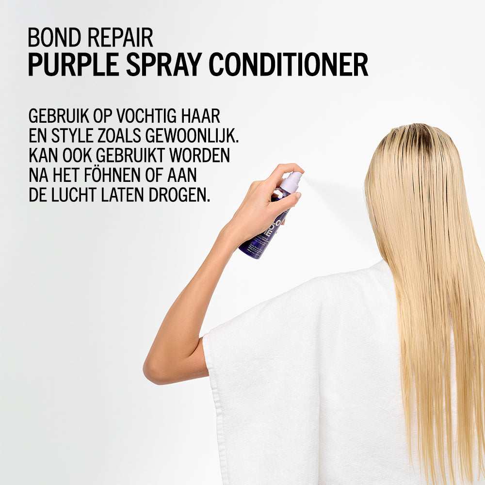 Schwarzkopf Professional Bond Repair Purple Spray Conditioner met BOND REPAIR TECHNOLOGY neutraliseert ongewenste gele ondertonen en voorkomt een koperachtige gloed. De lichte, niet-verzwarende formule ontwart het haar direct en laat een prachtige, zilveren glans achter. Verrijkt met amandelolie en korenbloem, voedt het de lokken en behoudt het een frisse, koele tint zonder de haarkleur te veranderen.