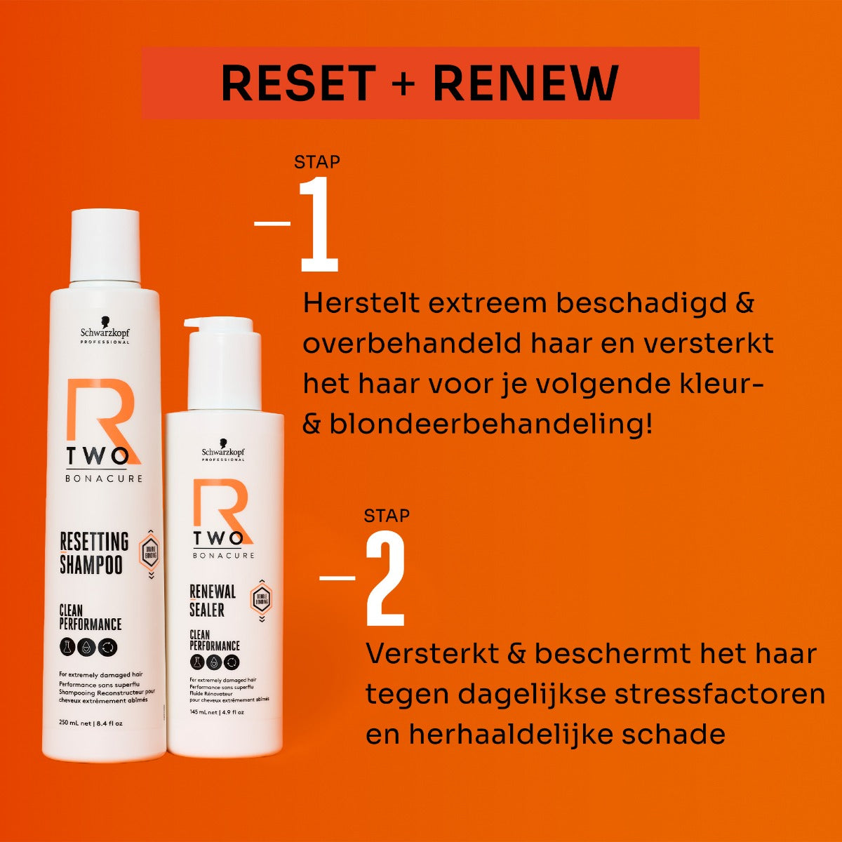 Na gebruik van de Schwarzkopf Professional R-TWO Resetting Shampoo is het haar op milde wijze gereinigd. De Resetting Shampoo werkt herstellend en versterkend. Waarbij nieuwe verbindingen in het haar worden opgebouwd, haarbreuk wordt verminderd en haarschade wordt hersteld. Het haar wordt snel weer gezond, soepel en glanzend.