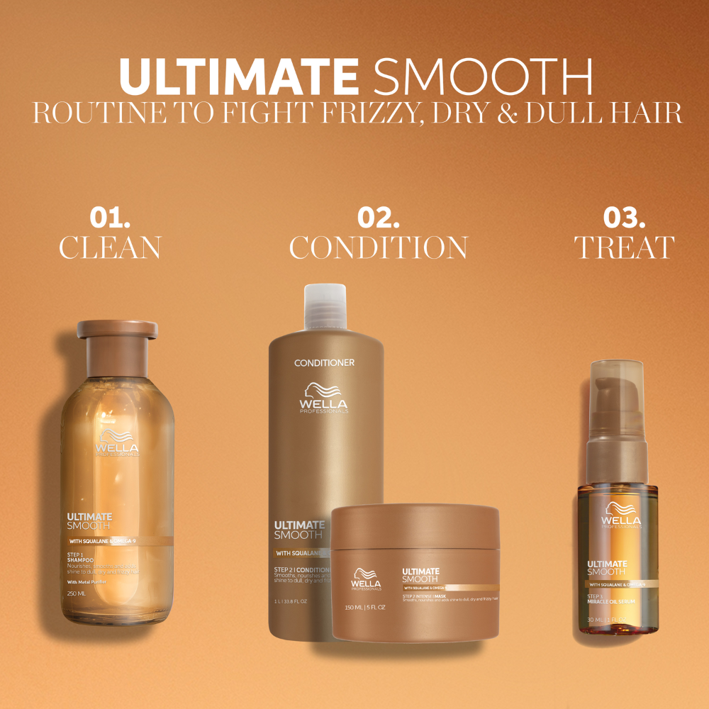 Wella Professionals Ultimate Smooth Miracle Oil Serum is een lichte, verfijnde haarolie met de textuur van een serum. Het voedt het haar diep van binnen en buiten, maakt het zichtbaar gladder en glanzender, en beschermt tegen hitte en UV-straling. Het serum zorgt voor pluisvrij haar tot wel 96 uur en maakt het haar zijdezacht.