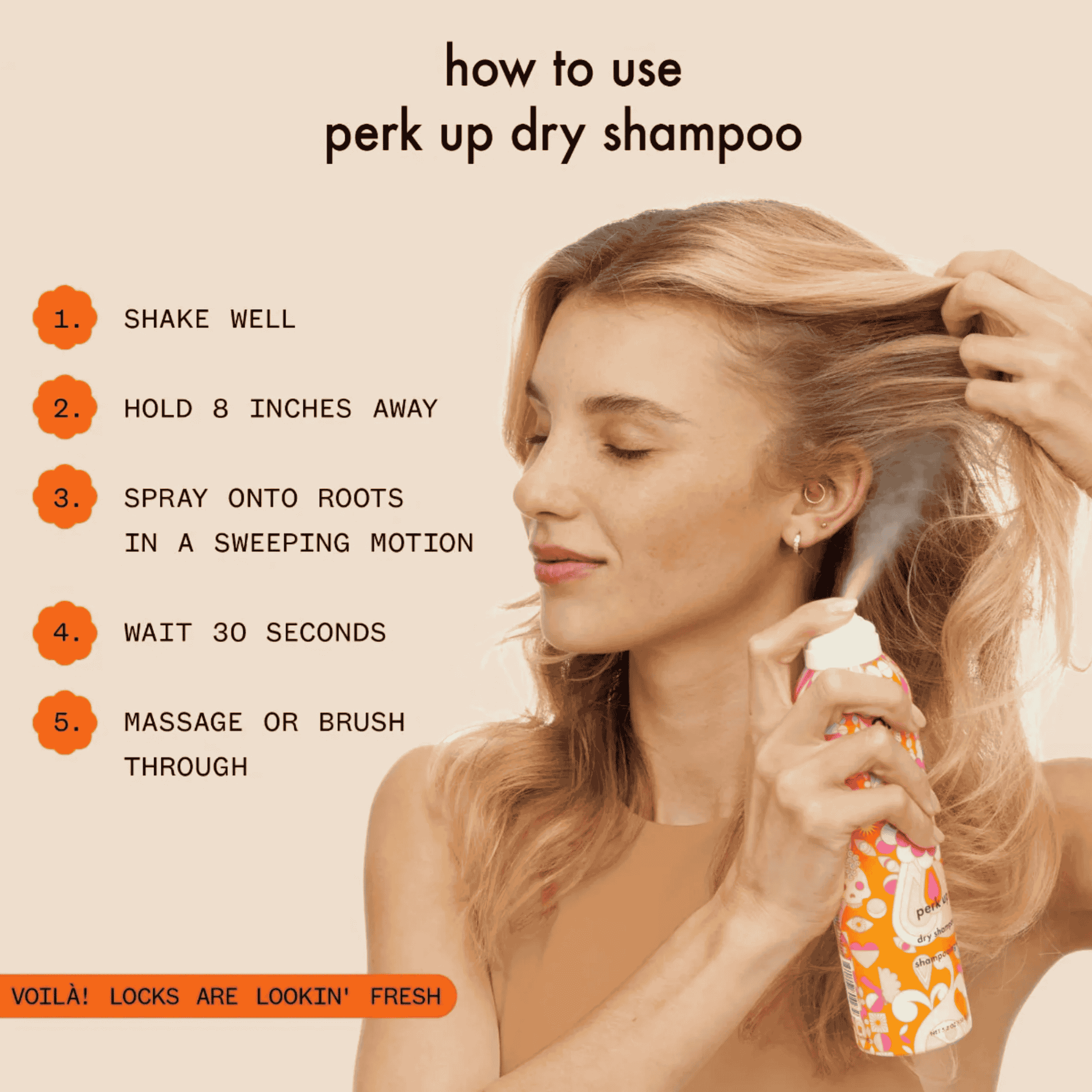 Voor het beste resultaat, schud de fles goed voor gebruik. Houd de spuitbus ongeveer 20 centimeter van je hoofd en spray met een vegende beweging op de haarwortels. Wacht ongeveer 30 seconden, zodat het product zijn magie kan doen. Werk het daarna door je haar met je vingers of borstel het door voor een gelijkmatige verdeling en een optimaal effect.