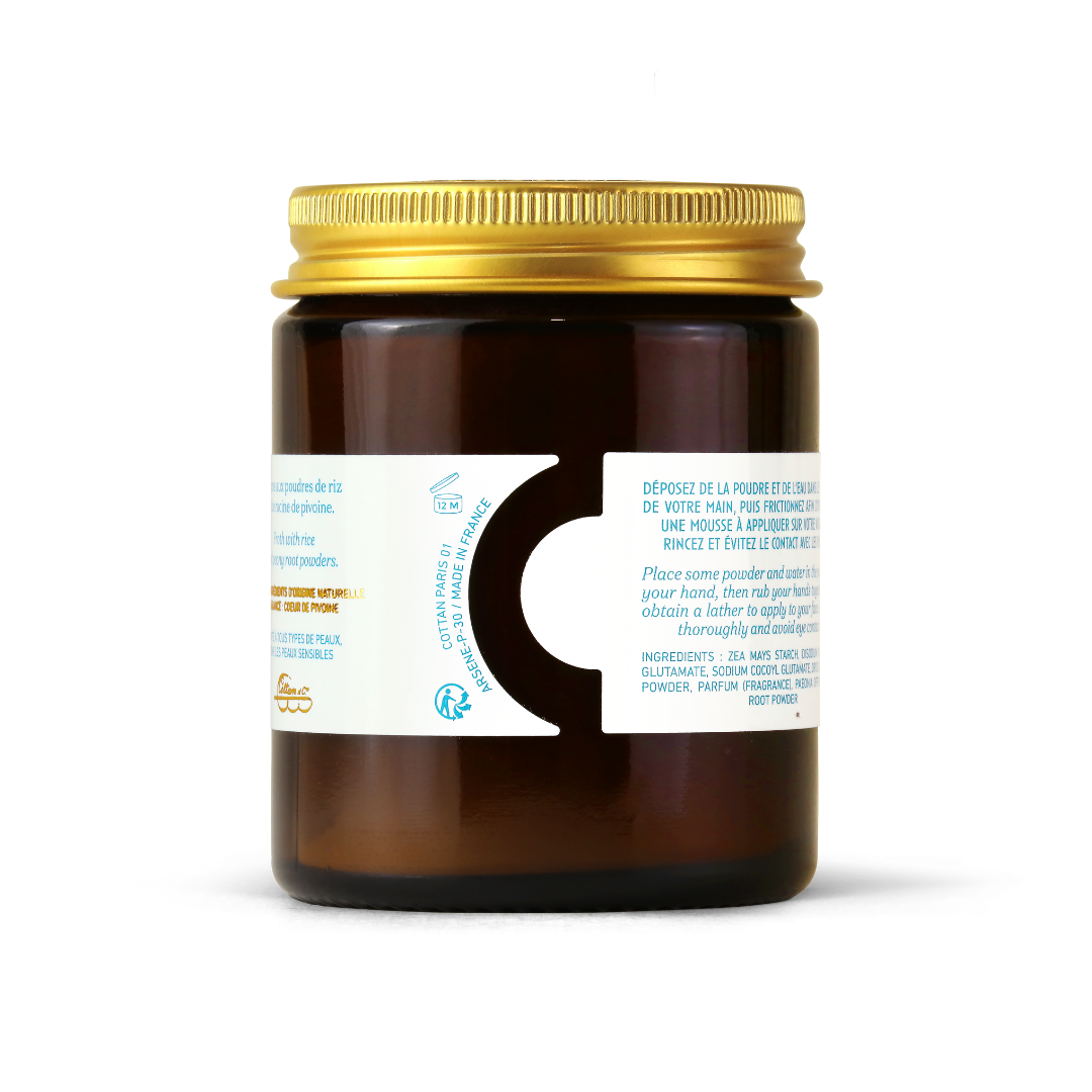 Strooi een kleine hoeveelheid poeder in je handpalm en voeg een paar druppels water toe. Wrijf je handen tegen elkaar tot een zacht schuim ontstaat en masseer dit over je gezicht. Vermijd de ogen. Spoel grondig af met lauwwarm water. De lichte geur van pioenroos maakt van je reiniging een ontspannend en zintuiglijk moment.