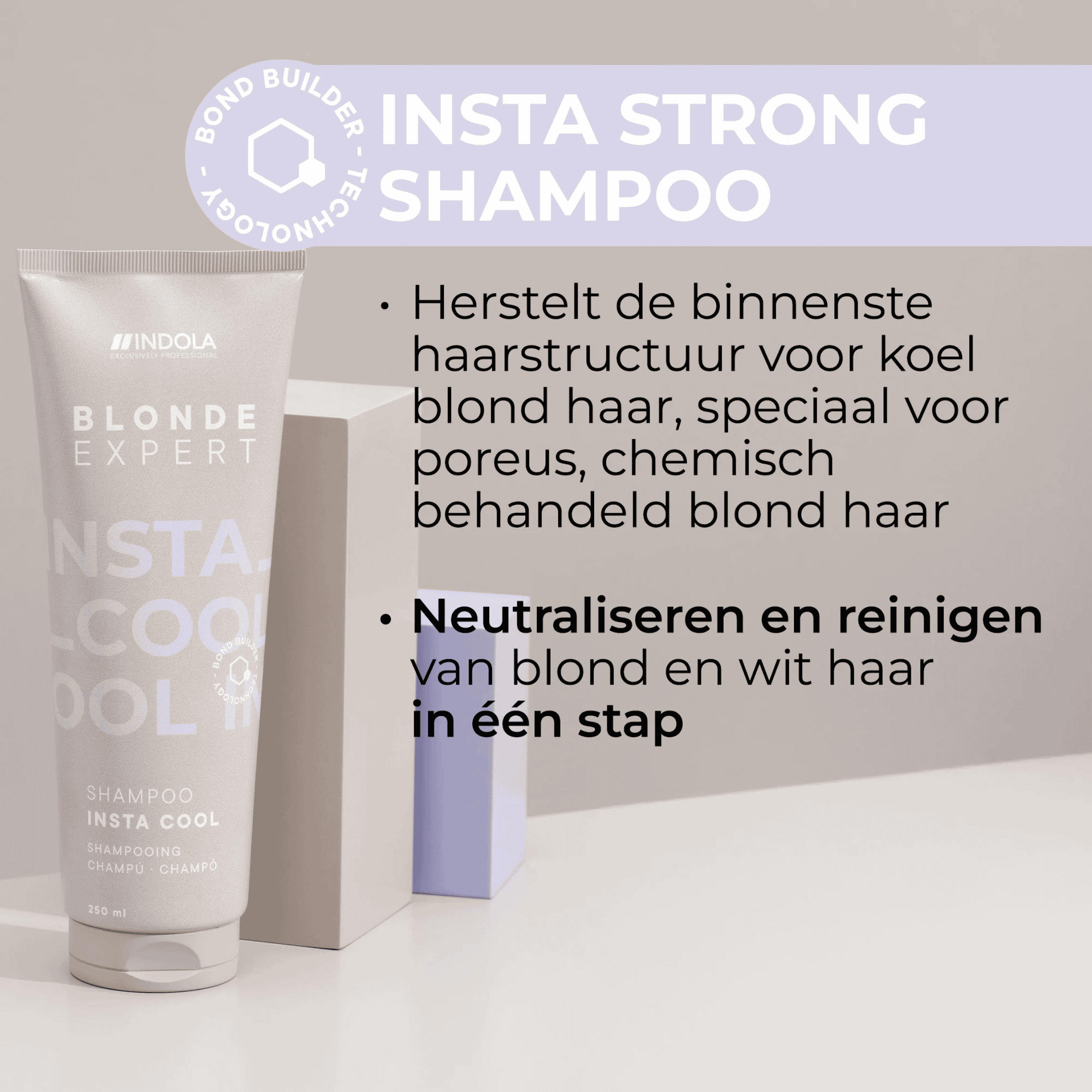 De Indola Blonde Expert Care Insta Cool Shampoo is een krachtige gepigmenteerde shampoo en speciaal ontwikkeld voor blondines, poreus en chemisch behandeld blond haar. Het is een rijke shampoo en zorgt voor een prachtige glans en zijdezacht haar. De shampoo verwijdert onmiddellijk koperachtige en gele ondertonen. De shampoo is verrijkt met de Hair Bond Technology+*, wat diep doordringt in de haarvezel. Het vormt een beschermende laag rond de natuurlijke bindingen en zo is het haar beschermt tegen haarbreuk tijdens het ontkleuren van het haar.