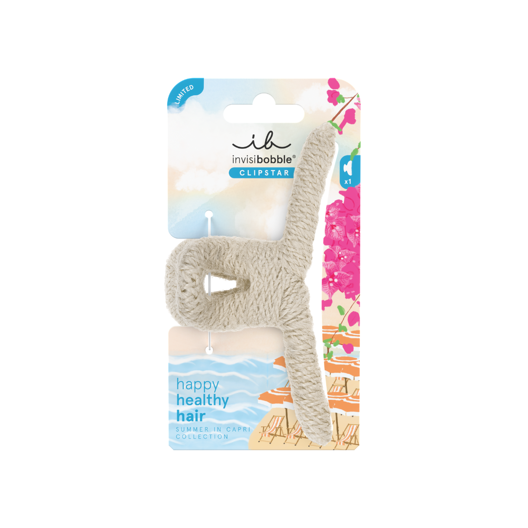 De invisibobble clipstar sunny sailor is een opvallende eyecatcher uit de limited Summer in Capri collectie. Deze grote haarklem is omwikkeld met raffia en straalt een moeiteloze mediterrane charme uit. De combinatie van rustiek design en hoogwaardige grip maakt deze haarclip hét accessoire voor zomerse dagen en avonden. Draag hem als finishing touch bij je strandoutfit, een zomerse avondjurk of een casual updo tijdens een wandeling door zonovergoten straten.