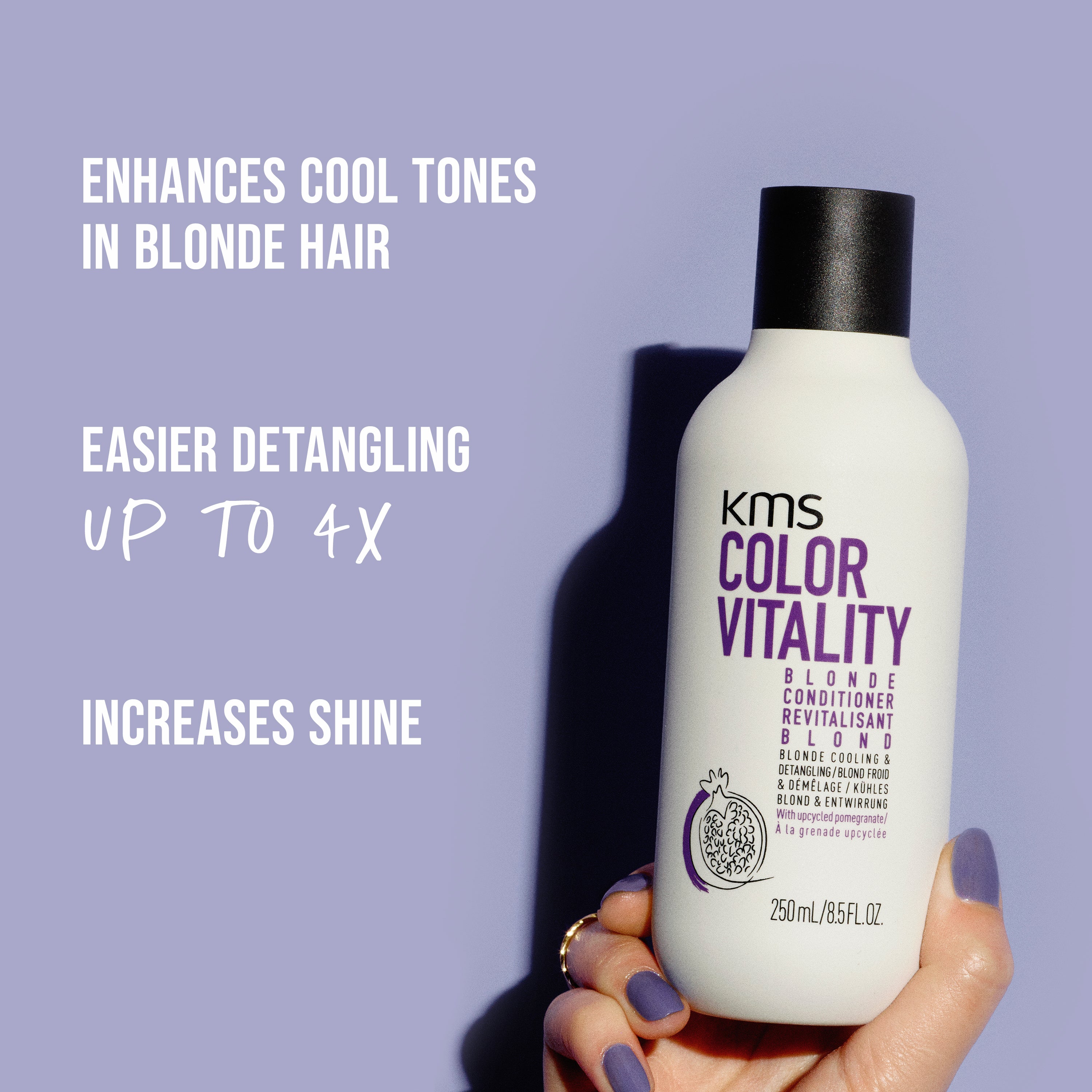 Conditioner voor blond of geblondeerd haar, die blondtinten verbetert en vergelen vermindert na één wasbeurt. KMS Hair Colorvitality Blonde Conditioner is speciaal ontwikkelt voor blond of geblondeerd haar. De conditioner herstelt beschadigd haar en maakt het haar zacht en soepel. Het verbetert blondtinten en vermindert vergelen van grijs, geblondeerd, gehighlight, natuurlijk blond, grijs of wit haar al na één keer gebruiken. De Lactic Acid ondersteunt het innelijke herstel van het haar.