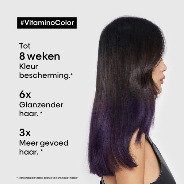 L'Oréal Professionnel Serie Expert Vitamino Color Shampoo behoudt de kleur van het gekleurde haar en laat het er gezond en glanzend uit.