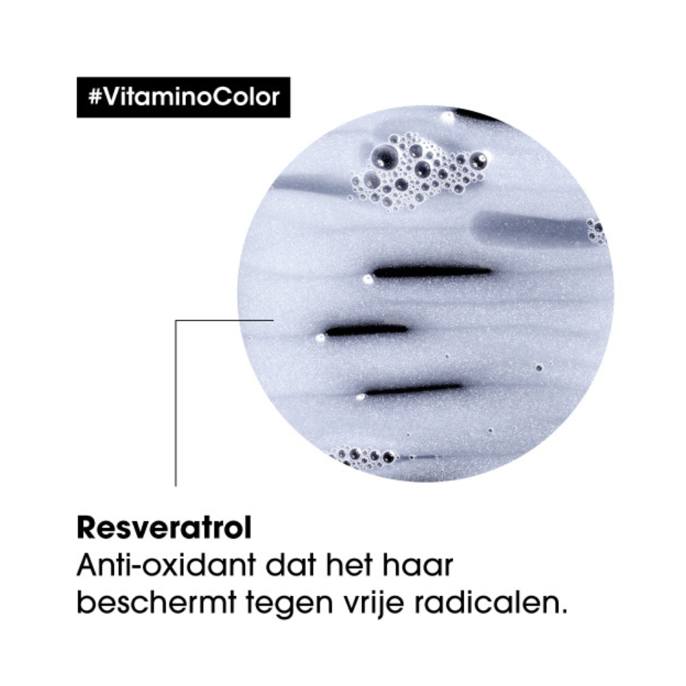 De L’Oréal Professionnel Serie Expert Vitamino Color shampoo is een kleurbeschermende shampoo speciaal ontwikkeld voor gekleurd haar. Beschermt het haar tegen vervagen en invloeden van buitenaf, tot wel 8 weken lang*. Het haar ziet er helderder uit en glanst meer. Ook voelt het haar lichter aan, handelbaar en zacht. De professionele formule is verrijkt met Resveratrol, een krachtige anti-oxidant, voor ultieme bescherming die de vervaging van de kleur tegenwerkt.