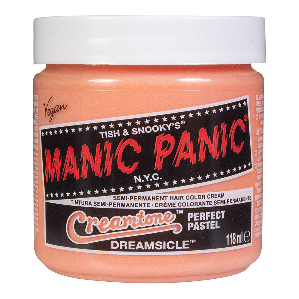 Manic Panic© Pastel Creamtones is een vegan, cruelty-free semi-permanente haarkleuringscrème voor het creëren van prachtige pasteltinten. Vrij van harde chemicaliën zoals ammoniak of waterstofperoxide en beschadigt het haar niet dankzij de hydraterende ingrediënten. Voor het allerbeste resultaat raden we je aan Manic Panic© Pastel Creamtones aan te brengen op lichtblond haar met minimaal kleurhoogte 10. De kleuring blijft tot 4 weken zichtbaar, afhankelijk van hoe vaak het haar gewassen wordt. We adviseren je het product voor gebruik te testen door middel van een patch- en strand test.