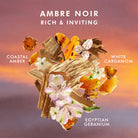 Ambre Noir - Rijk en uitnodigend, zoals een Marokkaanse souk. Kalmerende en verwarmende tonen: kustbarnsteen, geranium, witte kardemom en pittig kaneelblad.