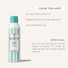 De Clear Tan Mist is een luchtige, verfrissende, niet-getinte zelfbruinende spray die je helpt om na 4-8 uur een prachtige bruine kleur te onthullen. De Aloë Vera is een cadeau voor de huid en laat het heerlijk glad en zacht aanvoelen, mede door het verkoelende effect van Aloë Vera. De Clear Tan Mist zorgt voor een natuurlijk, soepel, streeploos en langdurig resultaat.