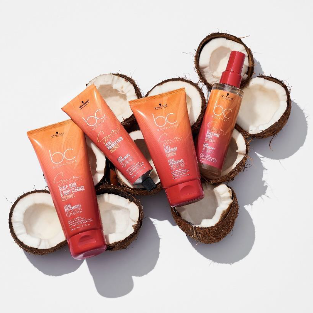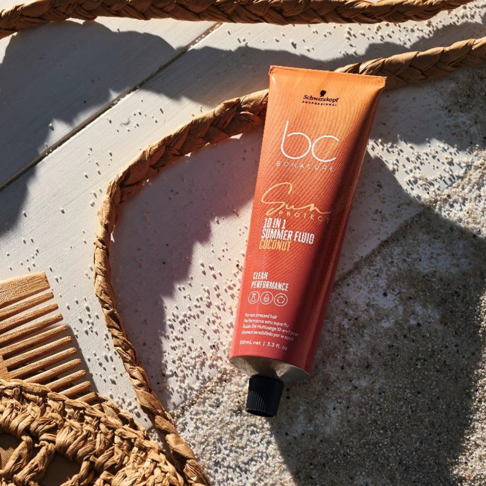 Schwarzkopf Bonacure Sun 10in1 Summer Fluid is een allround fluide dat beschadigd haar verzorgt. Het product voedt het haar en verzorgt de haarpunten, waardoor het haar gemakkelijk doorkambaar wordt. Schwarzkopf Bonacure Sun 10in1 Summer Fluid gaat kleurvervaging tegen en biedt bescherming tegen de hitte van stylingtools. De kokosolie voedt het haar en voorziet het van zacht, glad en glanzend haar.