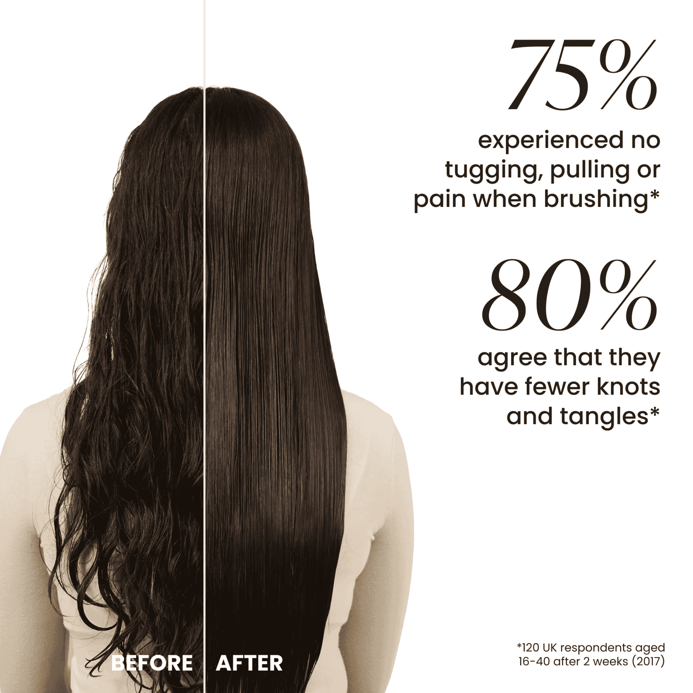 Een moeiteloos ontwarde, gladde en glanzende haardos. Je haar voelt zijdezacht aan, zonder beschadiging of haarbreuk, en oogt verzorgd en stralend bij elke look.