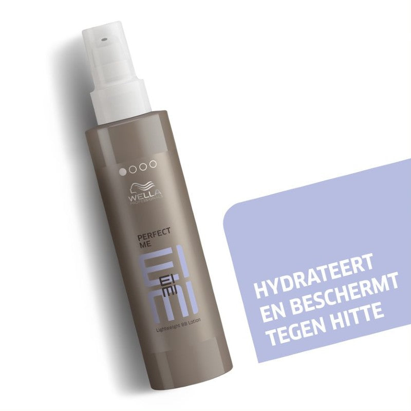 Wella EIMI Perfect Me is een lichtgewicht BB lotion voor het haar. De lotion herstelt en hydrateert het haar en gaat pluis tegen. Met Wella EIMI Perfect Me creëert u dus een ultiem zacht kapsel! Het geeft het haar glans en beschermt het haar bovendien tegen schade van hittetools. Daarnaast heeft Wella EIMI Perfect Me een lichte hold. Het perfecte product voor verzorging, styling en bescherming!